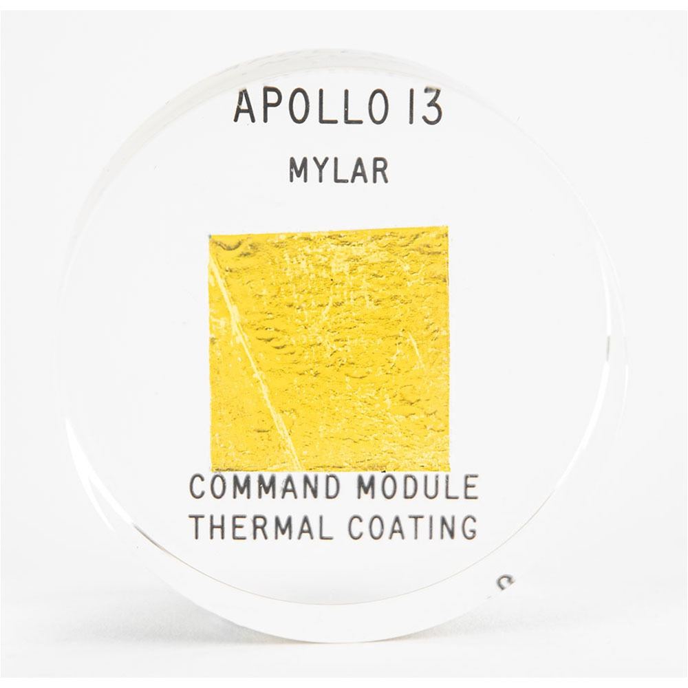 Large flown 1 x 1 swatch of Mylar thermal coating recovered from the Apollo 13 command module. Encased in a circular Lucite display with imprinted text: ‰ÛÏApollo 13 Mylar Command Module Thermal Coating.‰Û In fine condition.