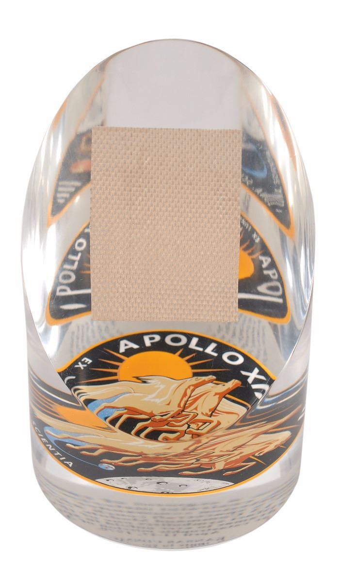 Larger than usual swatch of flown fabric from the backing material of the astronauts’ couches inside the Apollo 13 Command Module, measuring approximately 1.5 x 2, encased in a cylindrical 3 x 4.25 piece of lucite bearing an Apollo 13 emblem and certificate of authenticity at the bottom. Text on the bottom reads, in part: “This is a segment of the actual backing restraint material removed from mission commander James A. Lovell’s spacecraft couch aboard the Apollo 13 Command Module Odyssey’…Presented by Kansas Cosmosphere & Space Center as a tribute to your participation in the development of Universal Studio’s movie production of ‘Apollo 13.’” In fine condition. An excellent association between the near-catastrophic mission and its cinematic adaptation.