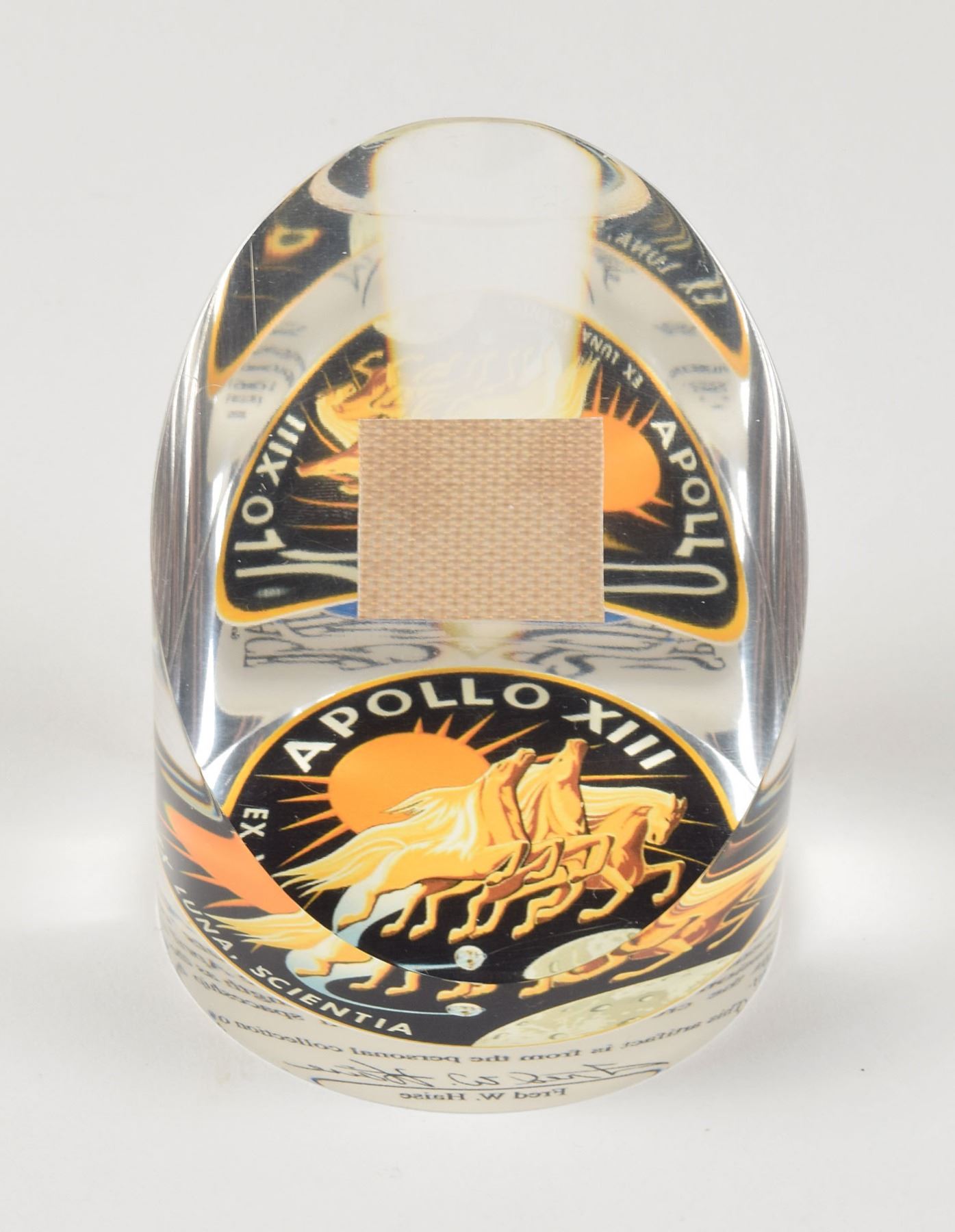 Limited edition flown swatch of fabric from the backing material of the astronauts’ couches inside the Apollo 13 Command Module, approximately 1 x .75, numbered 30/200. Encased in a cylindrical 2.75 x 3.25 piece of Lucite cut at an angle for display purposes, with an Apollo 13 emblem and certificate of authenticity at the bottom stating that the swatch originates from the personal collection of Fred Haise. In fine condition.
