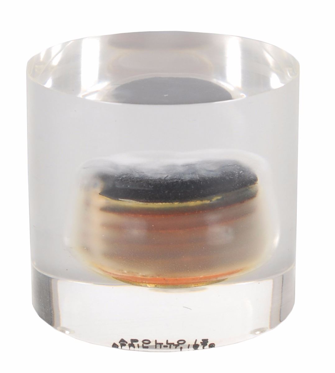 One of 59 flown Apollo 13 plugs removed from the heat shield of the command module Odyssey. The full plug measures approximately 1.25 x 1.25 and is encased in a 2.75 x 2.75 x 2.75 Lucite cylinder imprinted with the mission name and date. Bottom of plug is engraved, “44.” In fine condition. Accompanied by a letter of provenance from Virginia Swigert, the sister of command module pilot Jack Swigert, in part: “I certify that this…Heat Shield Plug in Lucite is from Jack Swigert’s personal collection.”