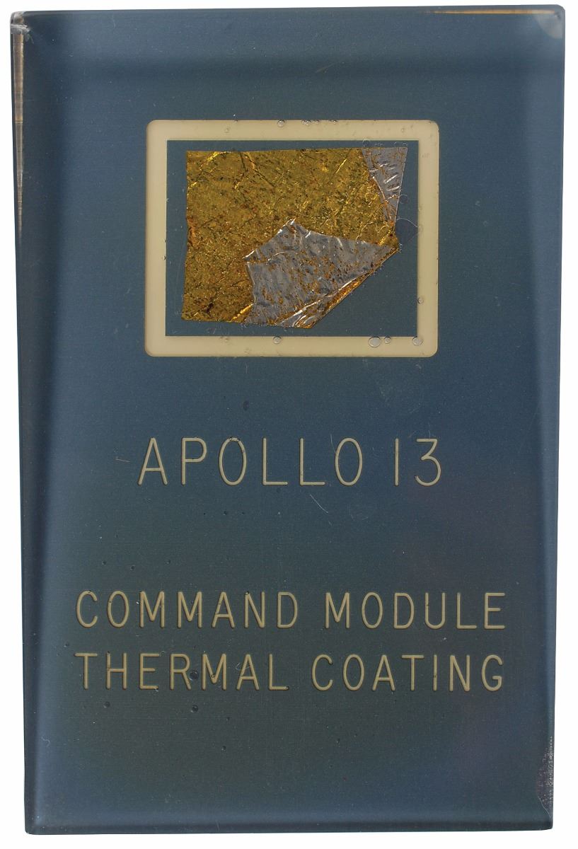 Flown 1 x .75 swatch of Kapton foil removed from the Apollo 13 command module Odyssey’s thermal coating. Housed in a Lucite display case with an engraved nameplate. In fine condition.