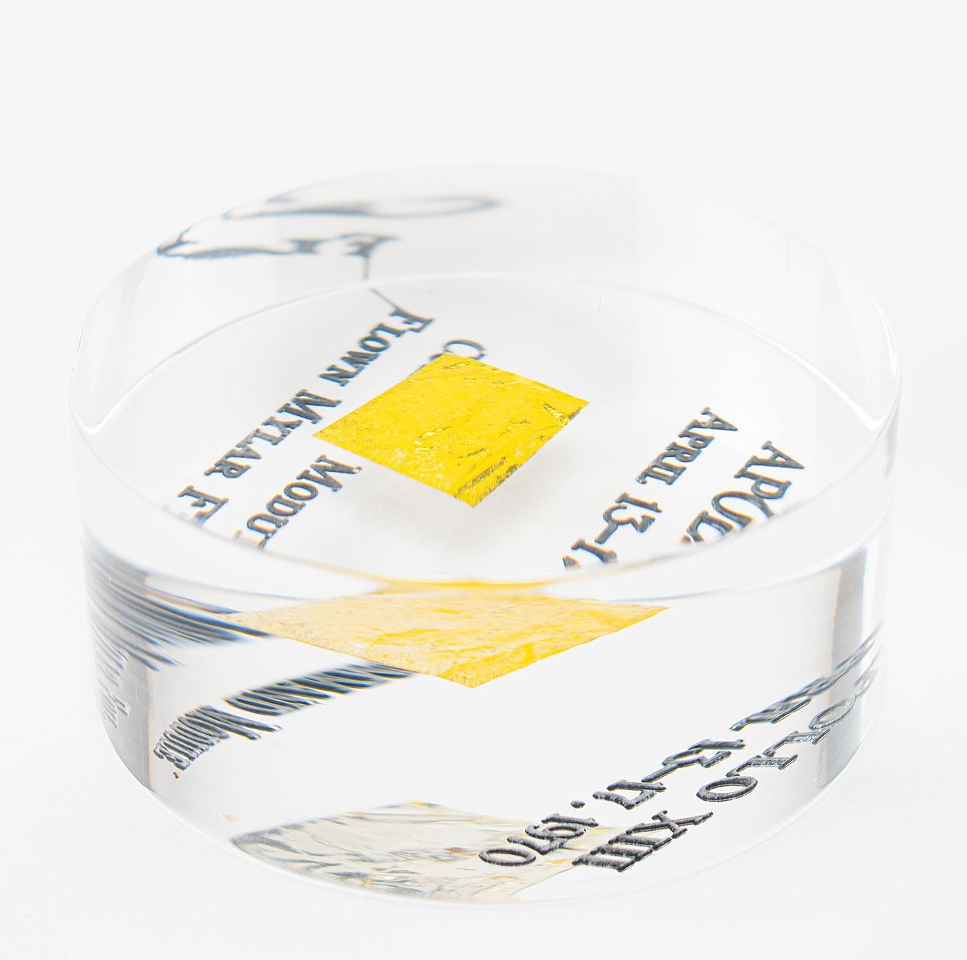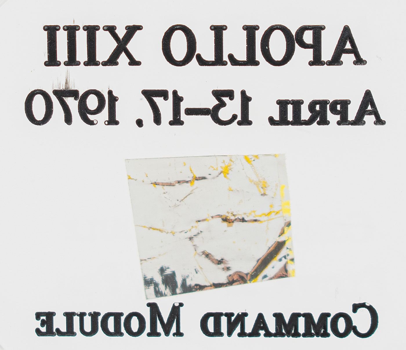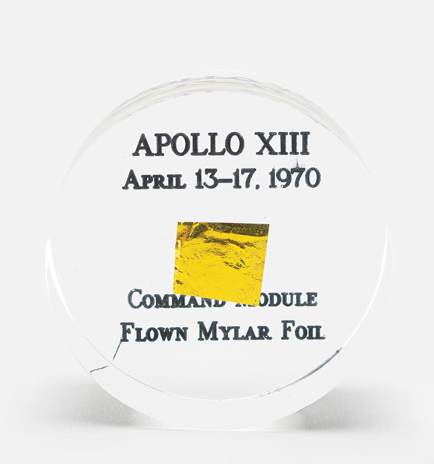 Flown .75? x .5? swatch of Kapton foil from the Apollo 13 Command Module Odyssey, encased in a Lucite display measuring 2.5? x 1?. In fine condition.