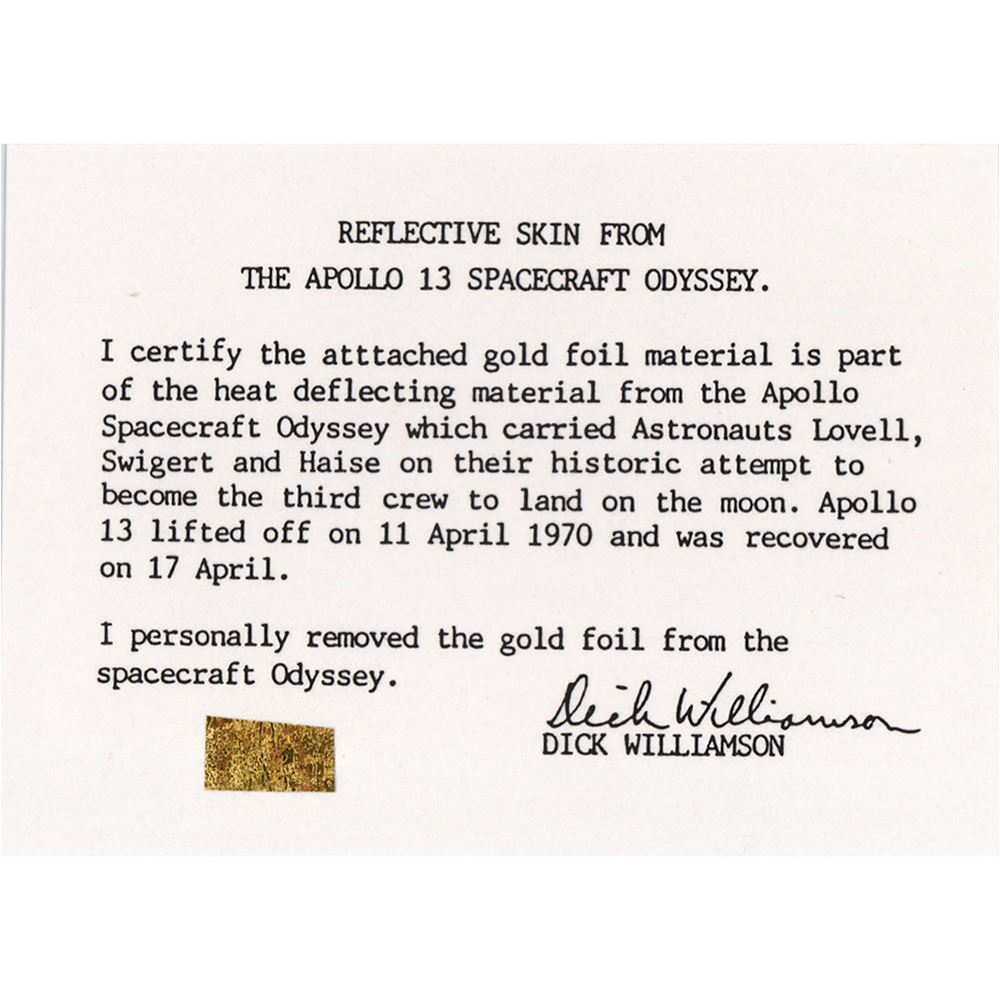 Small swatch of flown Kapton foil removed from the Apollo 13 CSM Odyssey, measuring .5è x .25è and affixed to a 3.5è x 2.5è card printed by NASA Recovery Team member Dick Williamson, who states: ‰ÛÏI certify the attached gold foil material is part of the heat deflecting material from the Apollo Spacecraft Odyssey which carried Astronauts Lovell, Swigert and Haise on their historic attempt to become the third crew to land on the moon‰Û_I personally removed the gold foil from the spacecraft Odyssey.‰Û In fine condition. Accompanied by an official glossy NASA photo of Williamson receiving his 40th work anniversary award.