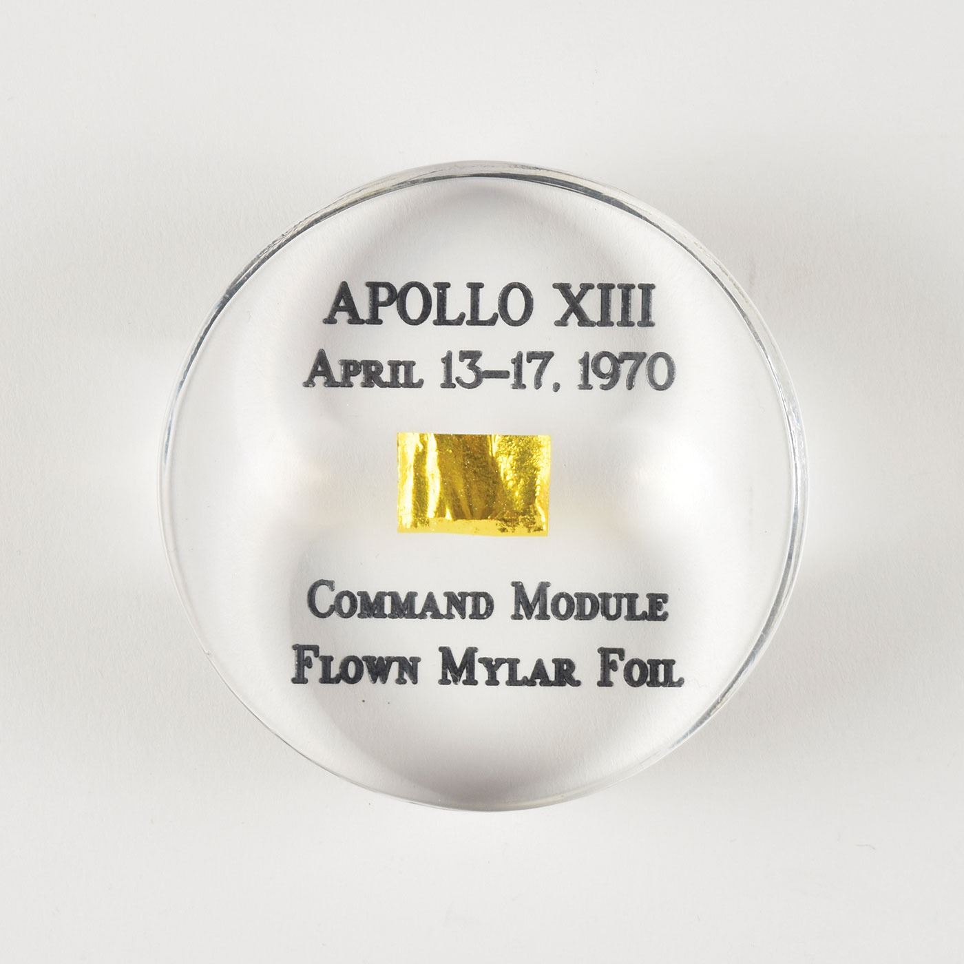 Flown .5 x .25 swatch of Mylar thermal coating recovered from the Apollo 13 command module. Encased in a circular Lucite display, 2.5? in diameter, with imprinted text: “Apollo XIII, April 13–17, 1970, Command Module, Flown Mylar Foil." In fine condition.