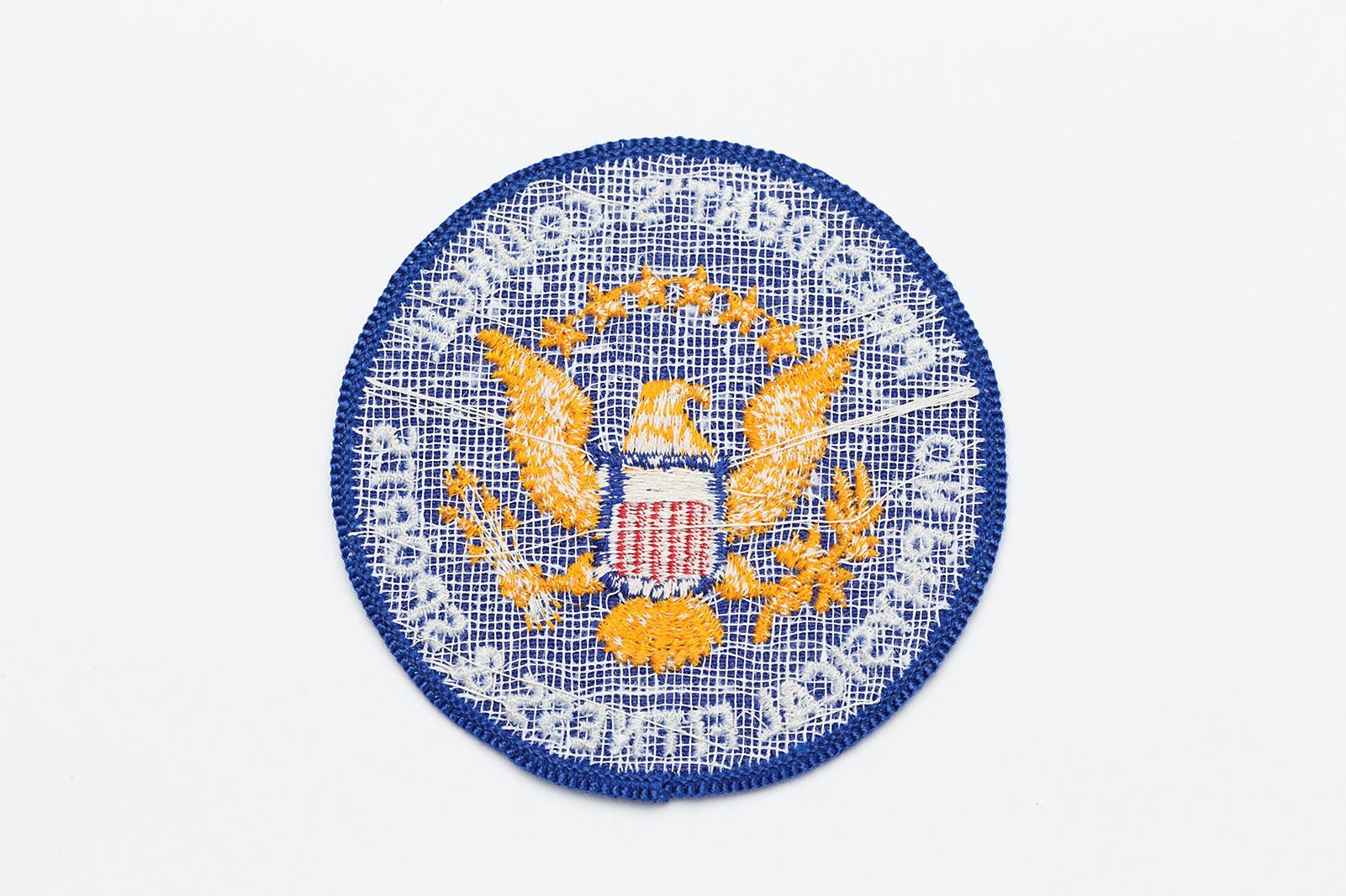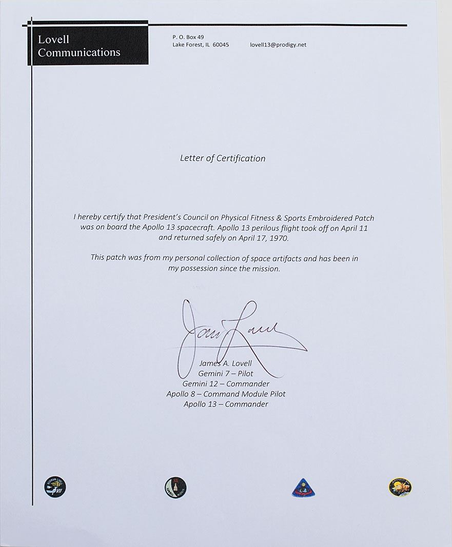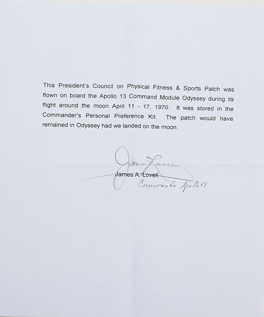 Flown embroidered "President's Council on Physical Fitness & Sports" patch carried aboard the Command Module Odyssey during the Apollo 13 mission, measuring 3? in diameter. In fine condition. Accompanied by two signed letters of authenticity from Apollo 13 Commander James Lovell. One letter, signed "James Lovell, Commander Apollo 13," in full: "The President's Council on Physical Fitness & Sports patch was flown on board the Apollo 13 Command Module Odyssey during its flight around the moon April 11-17, 1970. It was stored in the Commander's Personal Preference Kit. The patch would have remained in Odyssey had we landed on the moon." Accompanied by a zip-lock bag annotated in Lovell's own hand, "PCPFS Patches flown on Apollo 13." In fine condition.