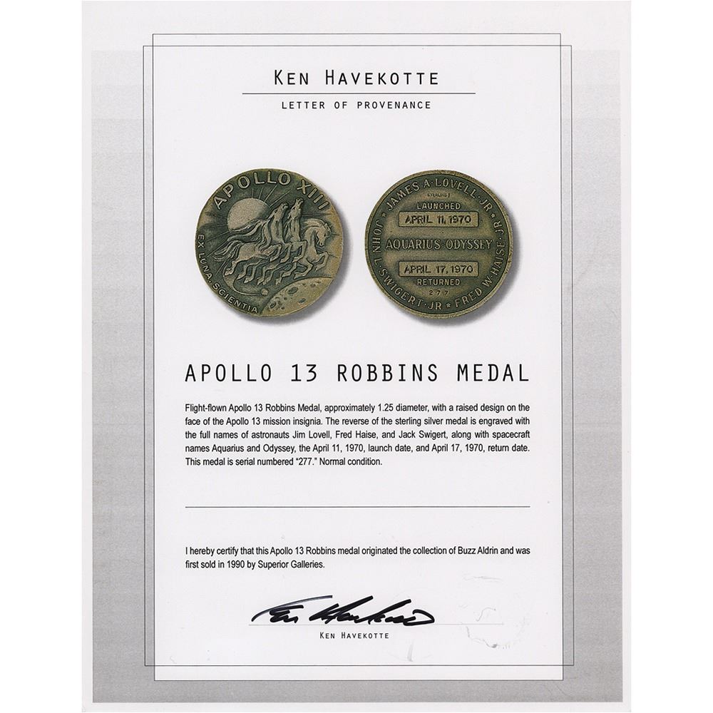 Flown sterling silver Apollo 13 Robbins medallion attested as deriving from the collection of Apollo 11 moonwalker Buzz Aldrin. The medallion, approximately 1.25è in diameter, features a raised design of the Apollo 13 mission insignia on the face‰ÛÓthree horses driving Apollo's chariot across the surface of the moon. The reverse boasts the names of the crew as flown, and is engraved with the launch date of April 11, 1970, and the return date of April 17, 1970. The medal is serial numbered "277" and stamped above with the Robbins "Sterling" hallmark. Condition is mint state. Accompanied by the original case and a letter of provenance from aerospace memorabilia specialist Ken Havekotte, certifying that the medal "originated from the collection of Buzz Aldrin and was first sold in 1990 by Superior Galleries."