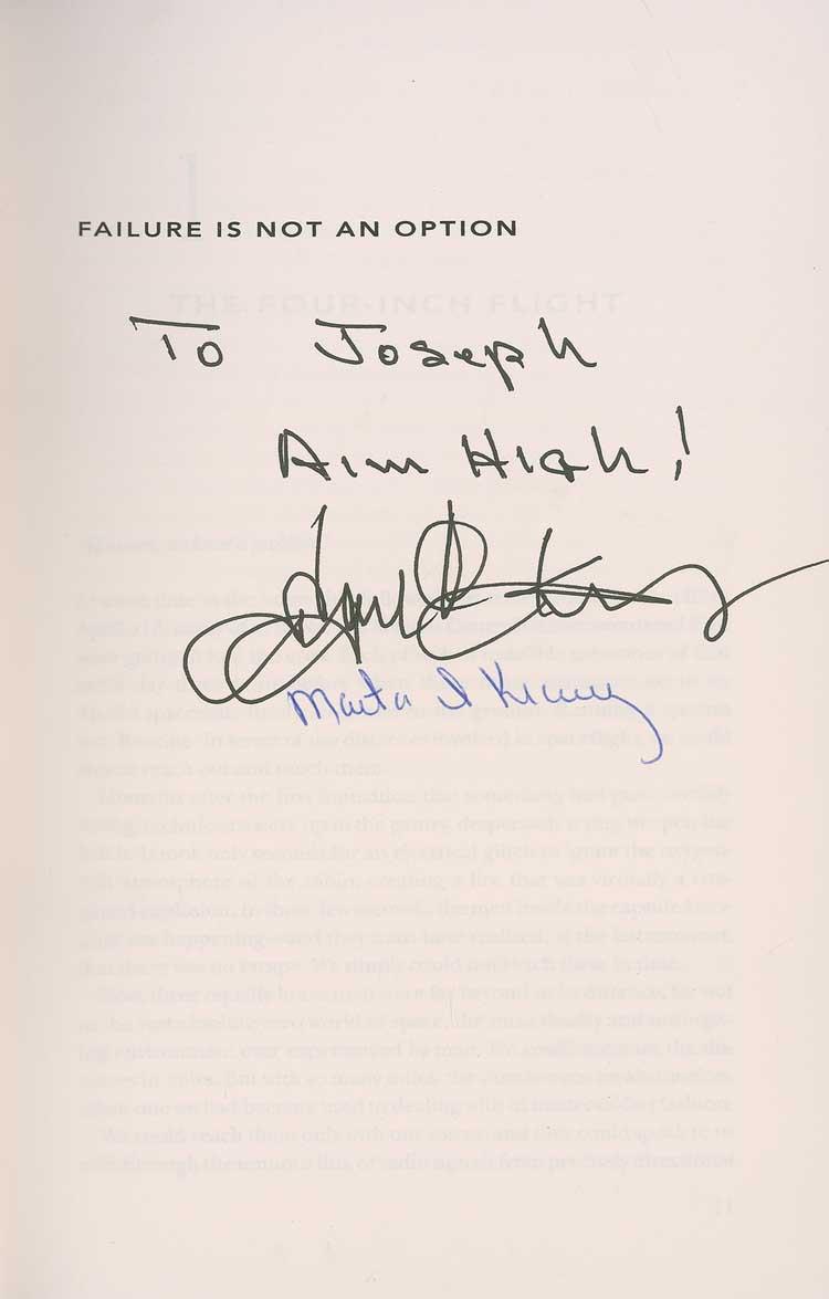 Signed book: Failure Is Not an Option. First edition, later printing. NY: Simon and Schuster, 2000. Hardcover with dustjacket, 6.5 x 9.5, 415 pages. Signed and inscribed on the half-title page after the table of contents, “To Joseph—Aim High! Gene Kranz” and also signed by his wife. In fine condition. Pre-certified Scott Cornish and RRAuction COA.