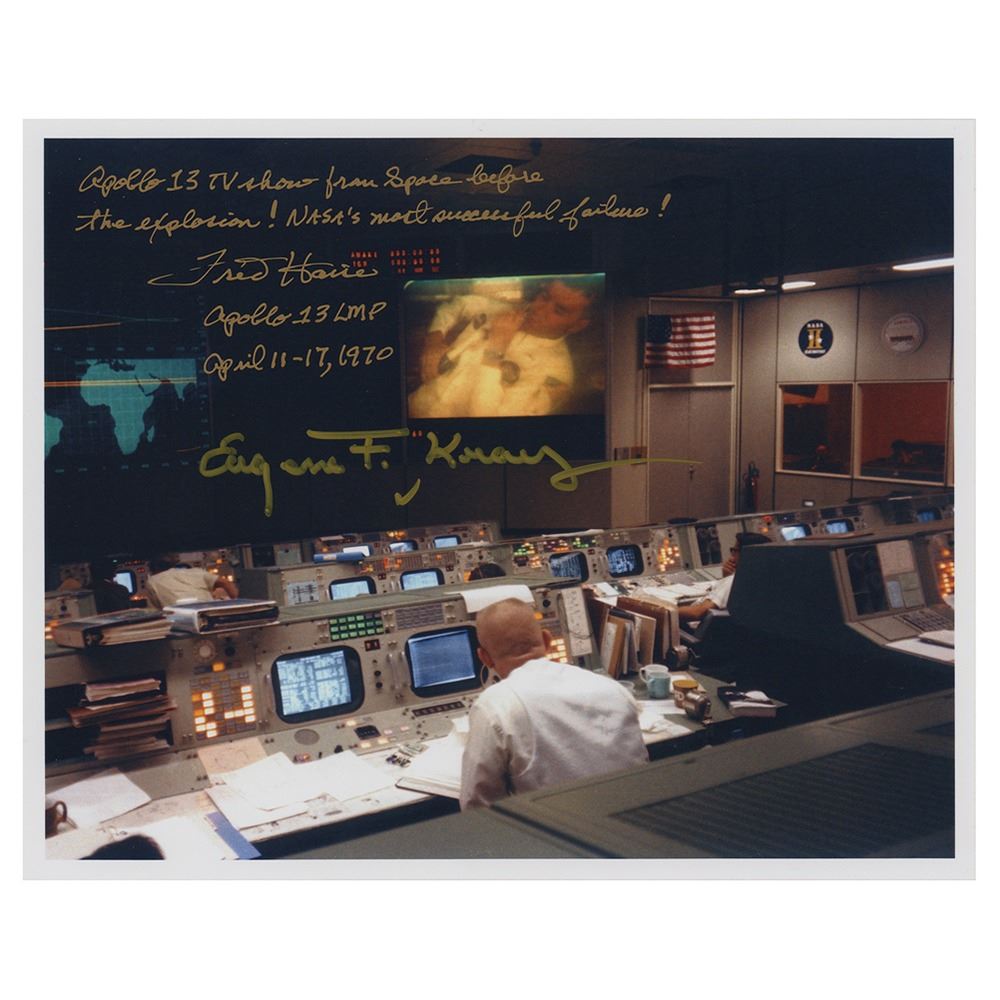 Color satin-finish 10 x 8 photo of Mission Control with Flight Director Gene Kranz in the foreground and LMP Fred Haise on the television screen in the background, signed in gold ink, "Apollo 13 TV show from Space before the explosion! NASA's most successful failure! Fred Haise, Apollo 13 LMP, April 11‰ÛÒ17, 1970" and "Eugene T. Kranz." In very fine condition.