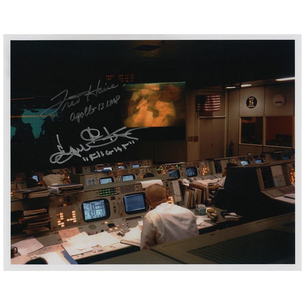 Color satin-finish 10 x 8 photo of Mission Control with Flight Director Gene Kranz in the foreground and LMP Fred Haise on the television screen in the background, signed in silver ink, "Fred Haise, Apollo 13 LMP" and "Eugene Kranz, 'Flight.'" In very fine condition.