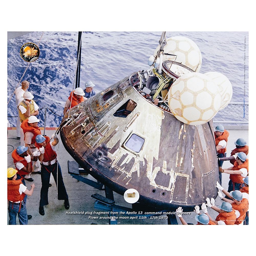 Small .25Ë x .25Ë fragment of heatshield plug attested to as being removed from the Apollo 13 Command Module Odyssey after its harrowing return flight and South Pacific Ocean recovery. The fragment is affixed to a color satin-finish 10 x 8 presentation photo of the Odyssey onboard the USS Iwo Jima after splashdown. In fine condition. Accompanied by a certificate of authenticity from Florian Noller of Spaceflori, who writes: “I certify that the honeycomb heatshield attached to the photo presentation is an authentic flown piece from the Apollo 13 Command Module ‘Odyssey.’ It was removed after the flight and kept by William Witte, NASA engineer for ablative heatshield at that time.†Noller has also signed and numbered the reverse of the presentation photo as “Sample #58.â€