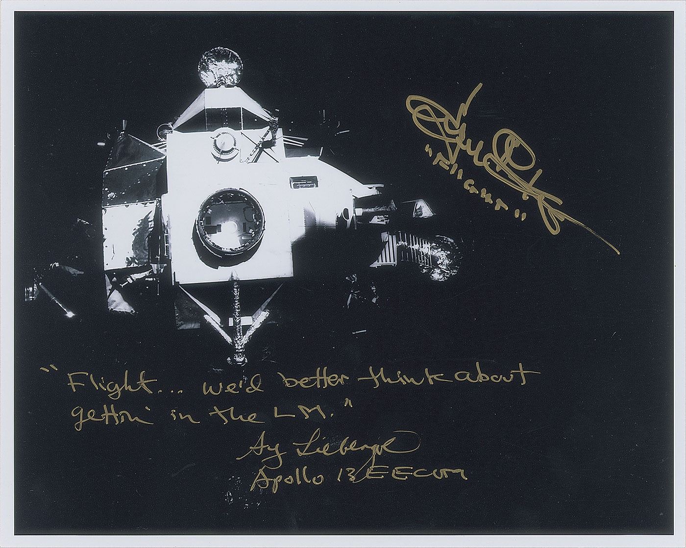 Satin-finish 10 x 8 overhead photo of the Apollo 13 lunar module Aquarius, signed in gold ink, "Gene Kranz, 'Flight,'" and "'Flight…we'd better think about gettin' in the LM.' Sy Liebergot, Apollo 13 EECOM." These were the actual words spoken by Liebergot to Kranz in the midst of that crisis. In very fine condition.