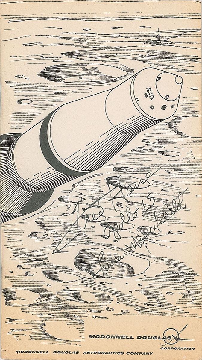 Uncommon McDonnell Douglas launch information guide for the Saturn V SA-508 rocket, the launch vehicle that would send the crew of Apollo 13 to the moon on April 11, 1970, signed on the front cover in black ink, "Fred Haise, Apollo 13, Lunar Module Pilot." The guide, forty pages, 3.75 x 6.75, prepared by A41 Test Planning & Evaluation, offers information on Launch Windows and Landing Site, Launch Phase, Translunar Injection, Translunar Coast & Lunar Impact Maneuvers, Lunar Arrival & Lunar Impact, and Spacecraft Mission. Additionally it covers vehicle mass comparisons for previous Saturn rockets and features an array of diagrams, schematics, and tracking charts relative to the mission. In fine condition, with some light edge toning.