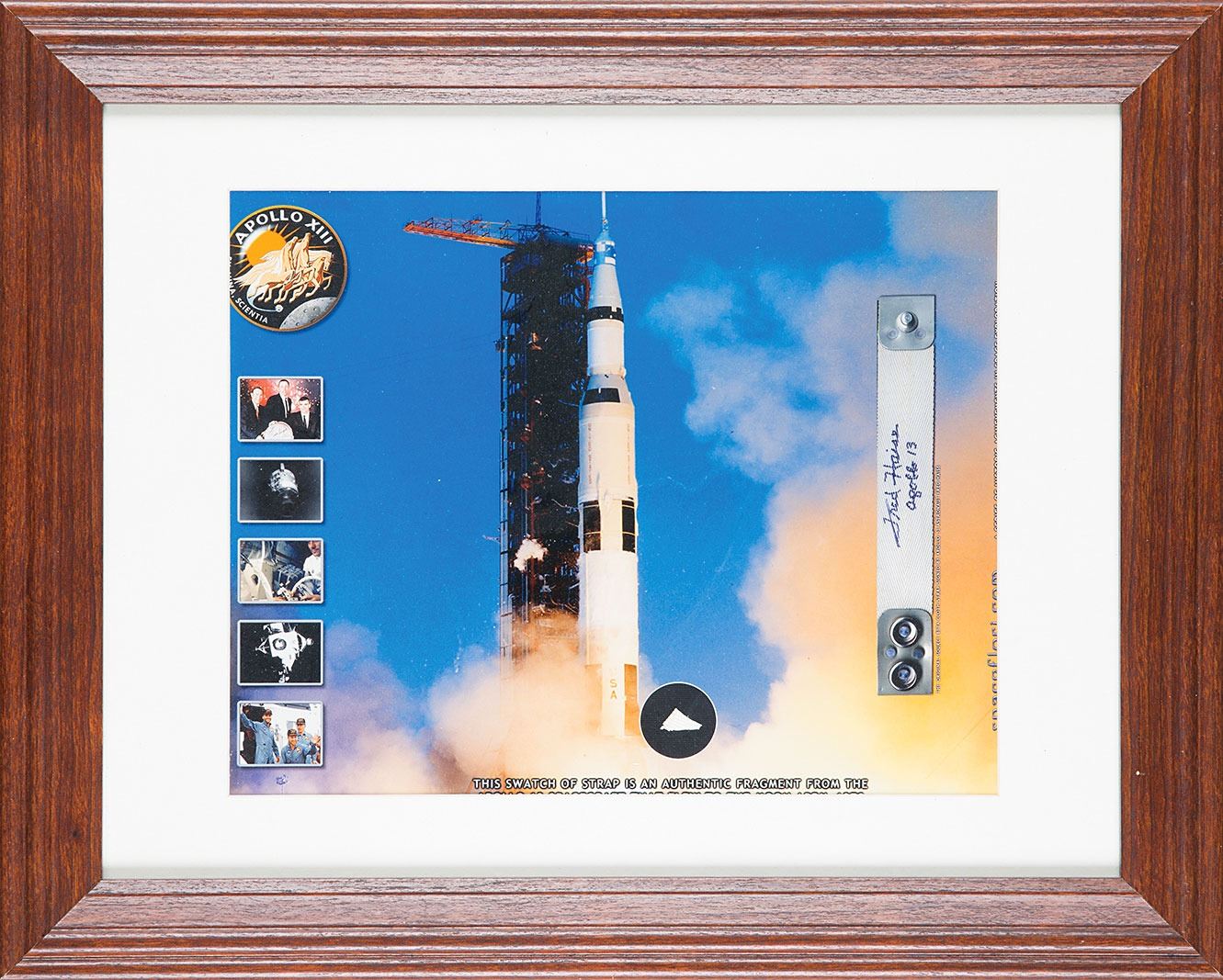 Limited edition flown .5 x .25 triangular swatch of a stowage locker strap carried into lunar orbit aboard the Command Module Odyssey during the historic Apollo 13 mission, numbered 4/50. The swatch is affixed to a color glossy photo showing the full stowage strap and other images from the Apollo 13 mission. The strap derives from container A-8 installed in the command module. Matted and framed to an overall size of 15 x 12. In fine condition. Accompanied by a certificate of authenticity from Florian Noller, a copy of the "Container A8" parts removal tag, and copies of the CM stowage areas.