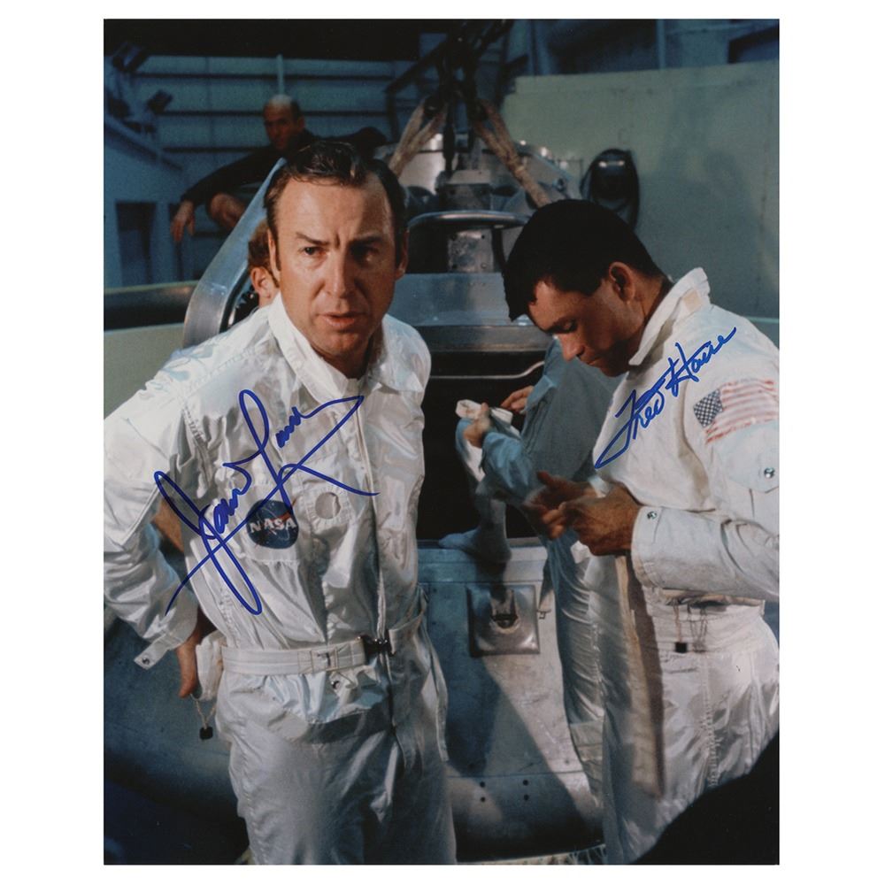 Color satin-finish 8 x 10 photo of Fred Haise and James Lovell during training for Apollo 13, signed in blue felt tip by both. In very fine condition.