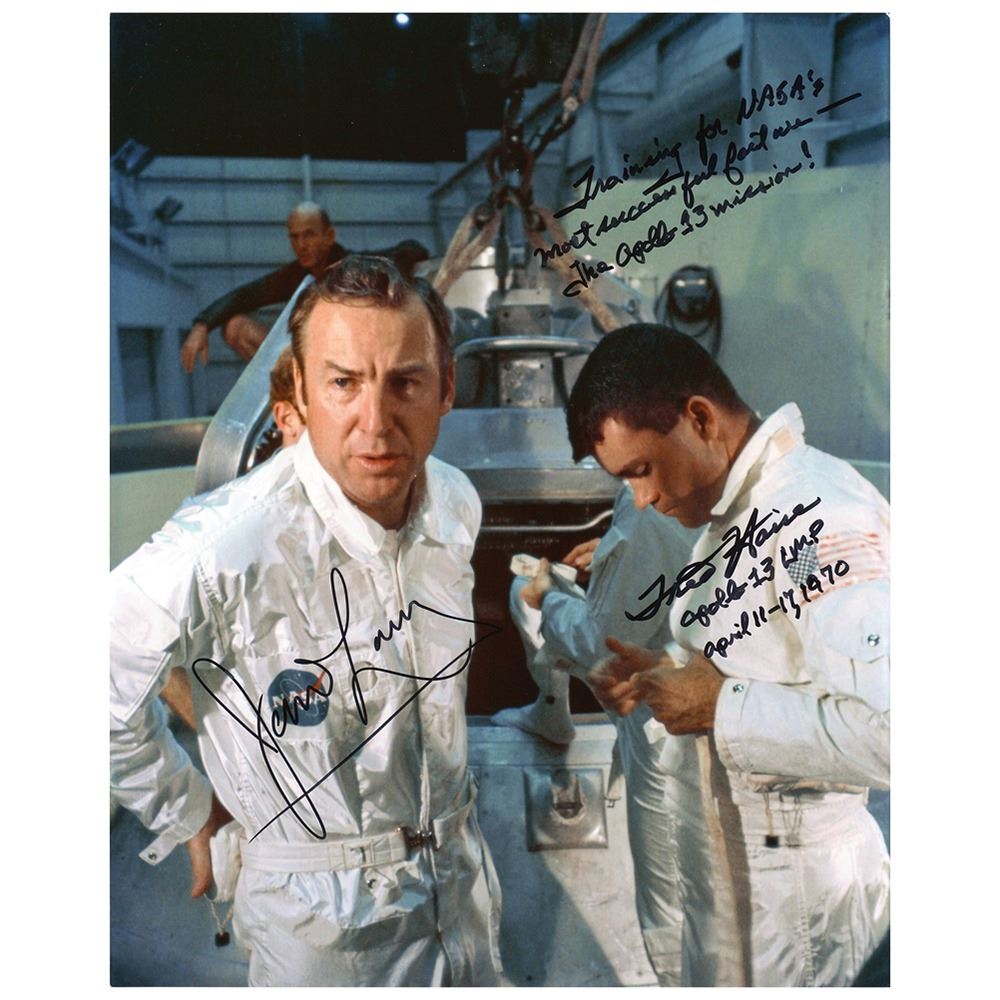 Desirable color glossy 8 x 10 photo of the two would-be moonwalkers during training, signed in black felt tip, "James Lovell" and "Training for NASA's most successful failure—The Apollo 13 mission! Fred Hause, Apollo 13 LMP, April 11–17, 1970." In fine condition.