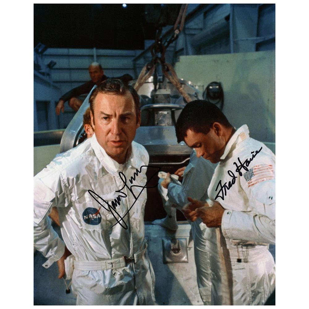 Desirable color glossy 8 x 10 photo of the two would-be moonwalkers during training, signed in black felt tip, "James Lovell" and "Fred Haise." In fine condition.