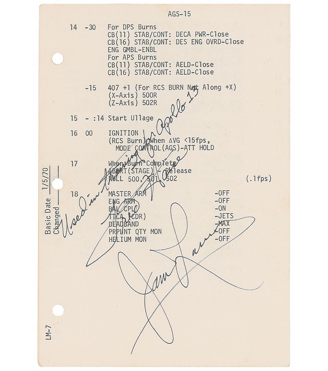 Apollo 13 LMS-2 double-sided checklist page, AGS-15 and 16, used during the mission’s training, 5.5 x 8, with star charts on both sides, signed on one side in black felt tip, “Used in training for Apollo 13, Fred Haise,” and “James Lovell.” In fine condition. Accompanied by a photocopy of the manual’s cover and first page.