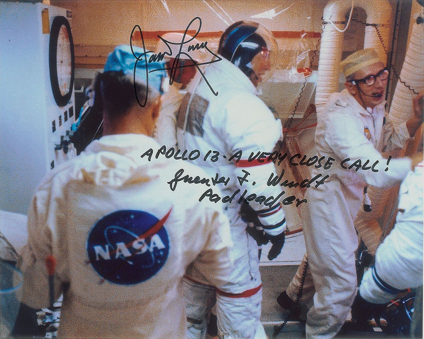 Color satin-finish 10 x 8 photo of Apollo 13 Commander James Lovell in his white space suit conversing with NASA personnel and Pad Leader Guenter Wendt, signed in black felt tip, "James Lovell" and "Apollo 13—A very close call! Guenter F. Wendt, Pad Leader." In very fine condition.
