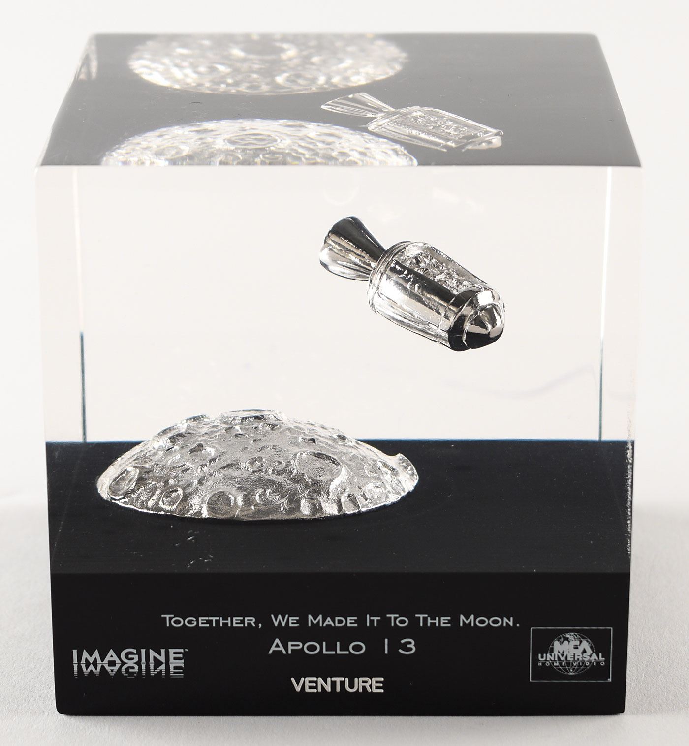 Attractive post-production gift from Imagine and Universal Pictures for the successful release of the award-winning 1995 film Apollo 13, featuring a small service module model showing damage from the oxygen tank explosion floating above the lunar surface, encased in a 4 x 4 x 4 block of Lucite with black base engraved: "Together, we made it to the Moon. Apollo 13, Venture." In fine condition. Consignor notes that these Lucite display pieces were presented to VIPs by the Imagine production company.