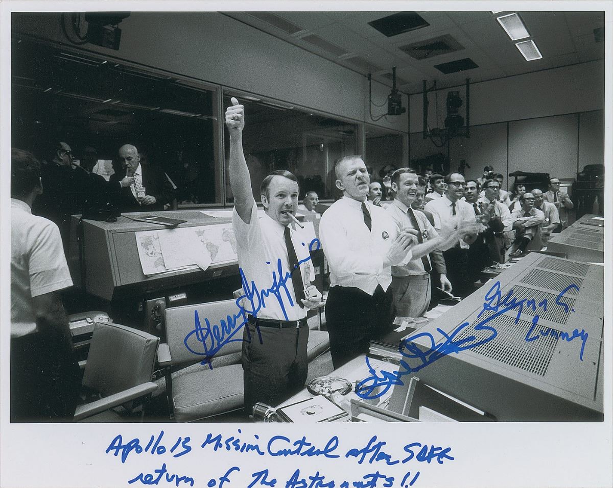Satin-finish 10 x 8 photo of mission control celebrating the safe return of the Apollo 13 crew, signed in blue felt tip by Gerry Griffin, Gene Kranz, and Glynn S. Lunney, who adds in the lower border, “Apollo 13 mission control after safe return of the astronauts!!” In very fine condition.