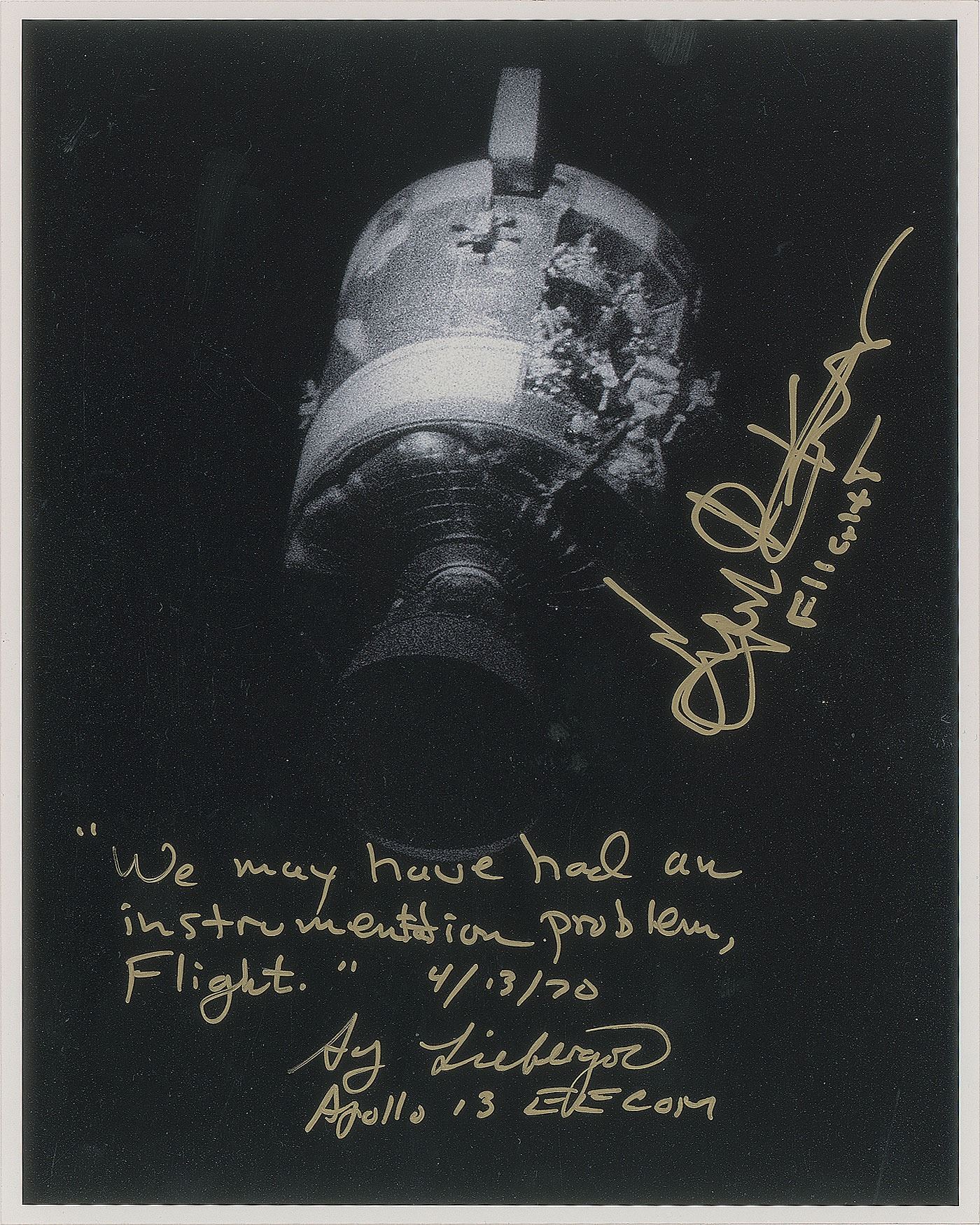 Satin-finish 8 x 10 photo of the crippled Apollo 13 service module floating in space, signed in gold ink, "Gene F. Kranz, Flight" and "Sy Liebergot, Apollo 13 EECOM," who adds: "'We may have had an instrumentation problem, Flight,' 4/13/70." In very fine condition.