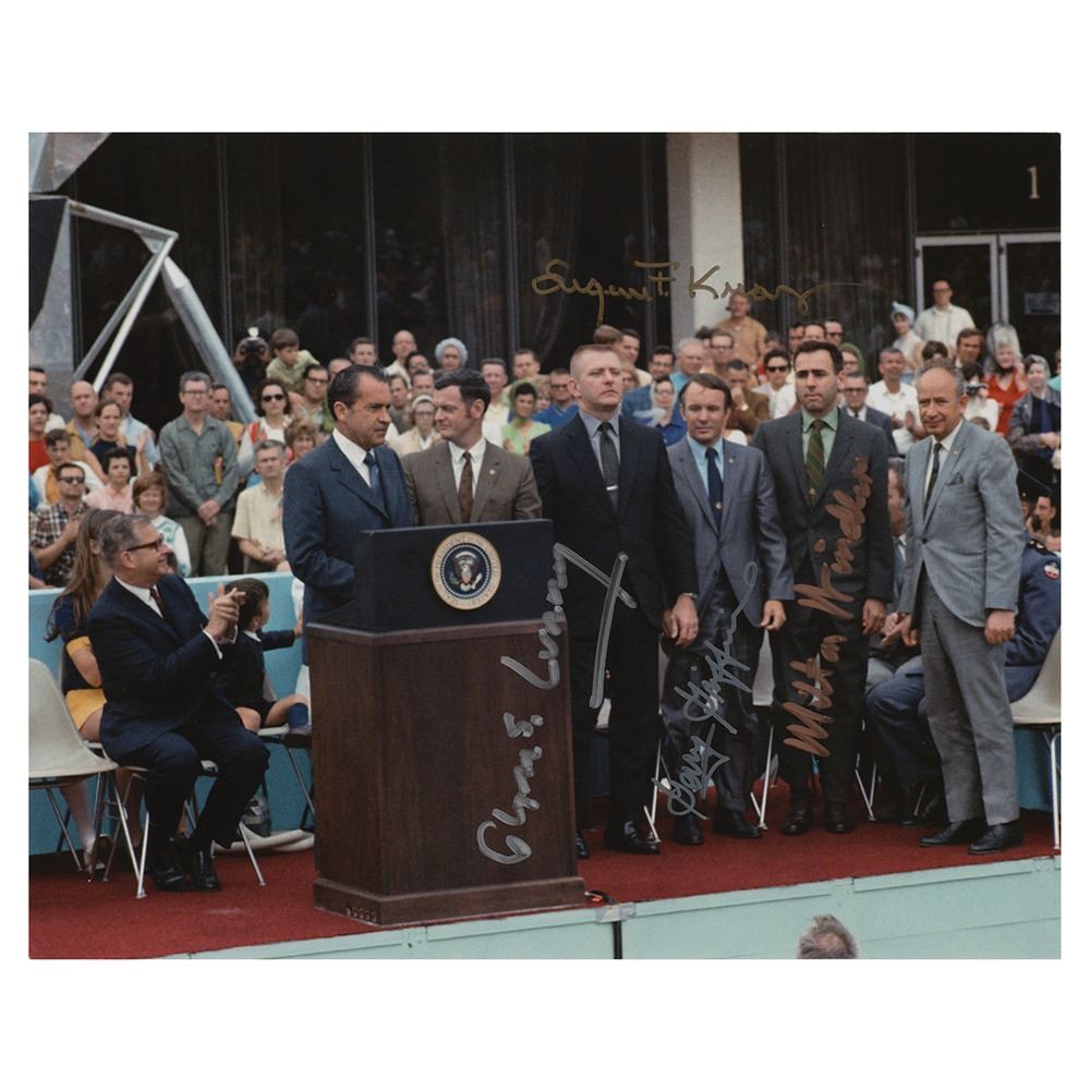 Color satin-finish 10 x 8 photo of President Richard Nixon honoring Apollo 13's heroic mission operations team, signed in ink by Gene Kranz, Glynn S. Lunney, Gerry Griffin, and Milton Windler. In fine condition.