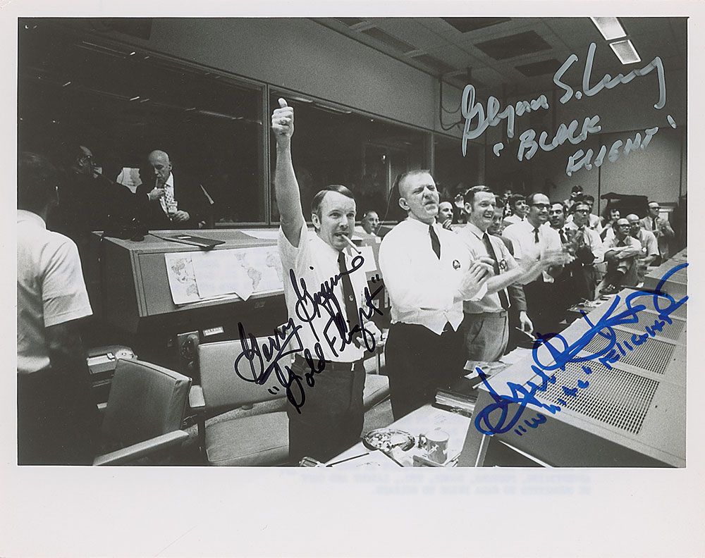 Official 10 x 8 NASA glossy photo of mission control celebrating the successful conclusion of the Apollo 13 mission, signed in ink and felt tip by Gene Kranz, Gerry Griffin, and Glynn Lunney, each adding their assignments under their signatures. In fine condition.
