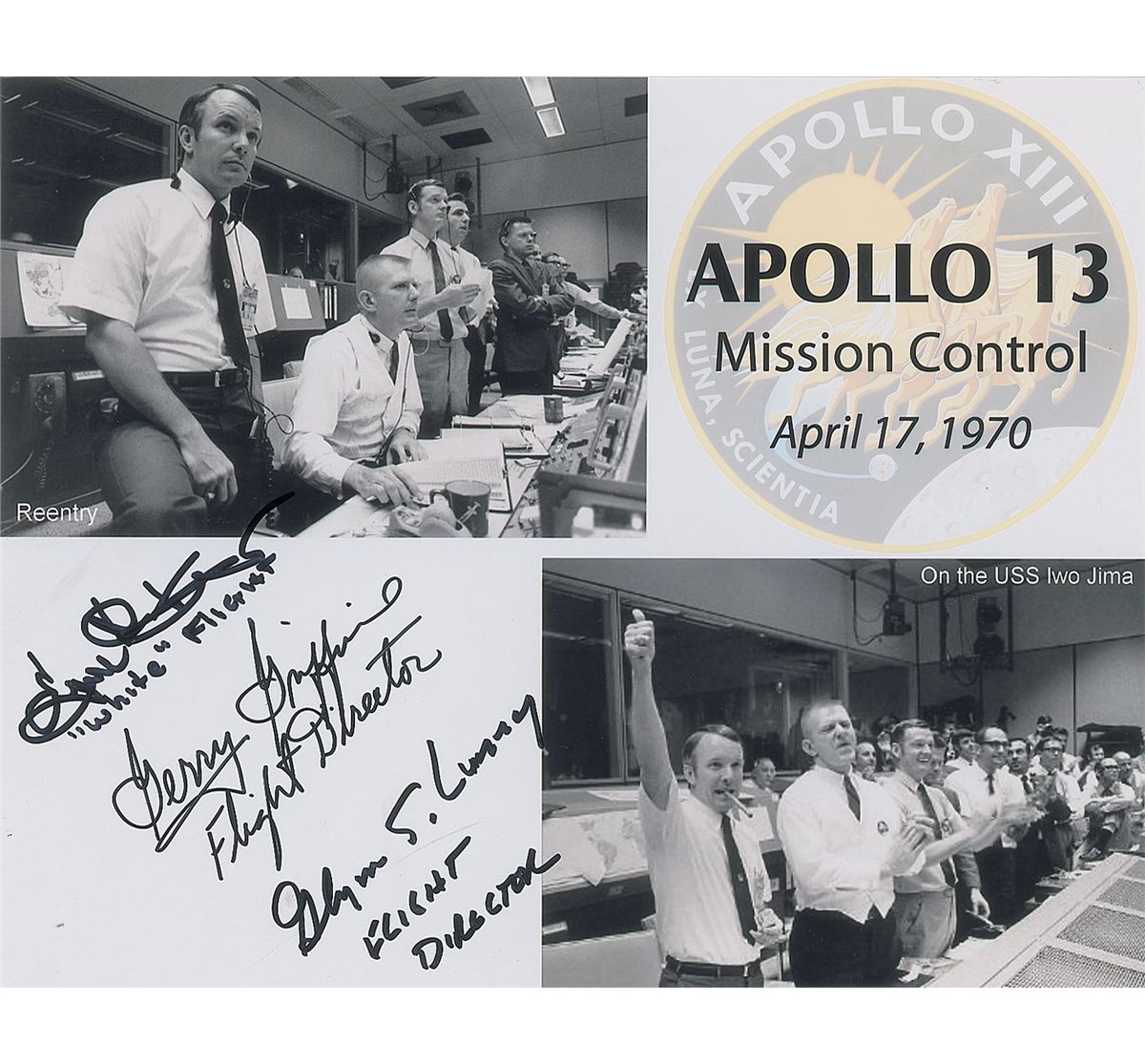 Glossy 10 x 8 composite photo of the tense atmosphere inside mission control at the end of the mission, signed in black felt tip by Gene Kranz, Gerry Griffin, and Glynn Lunney, each adding his flight designation below his signature. In very fine condition.