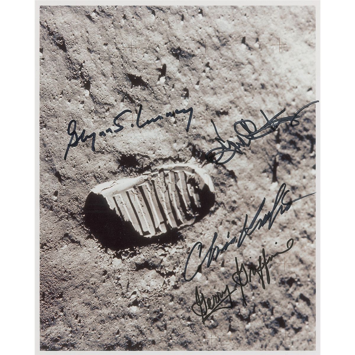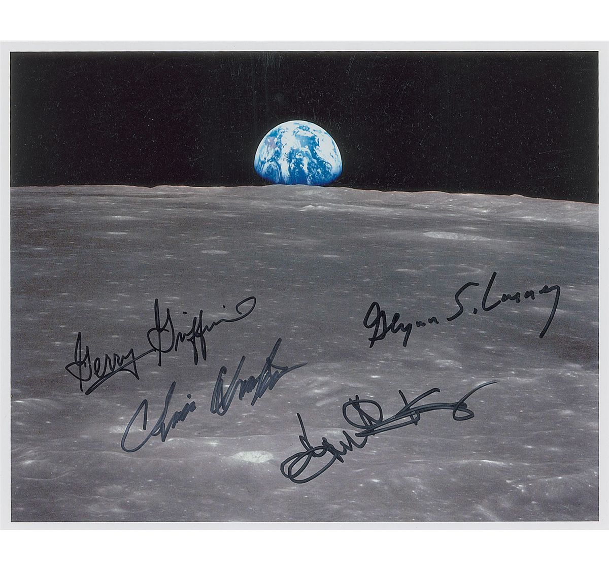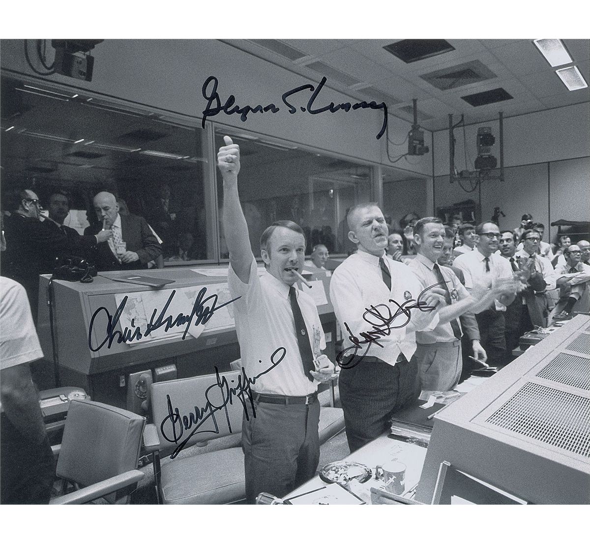 Three different satin-finish photos, 8 x 10 and 10 x 8, each signed in black felt tip by Gene Kranz, Chris Kraft, Glynn Lunney, and Gerry Griffin. In overall fine condition.
