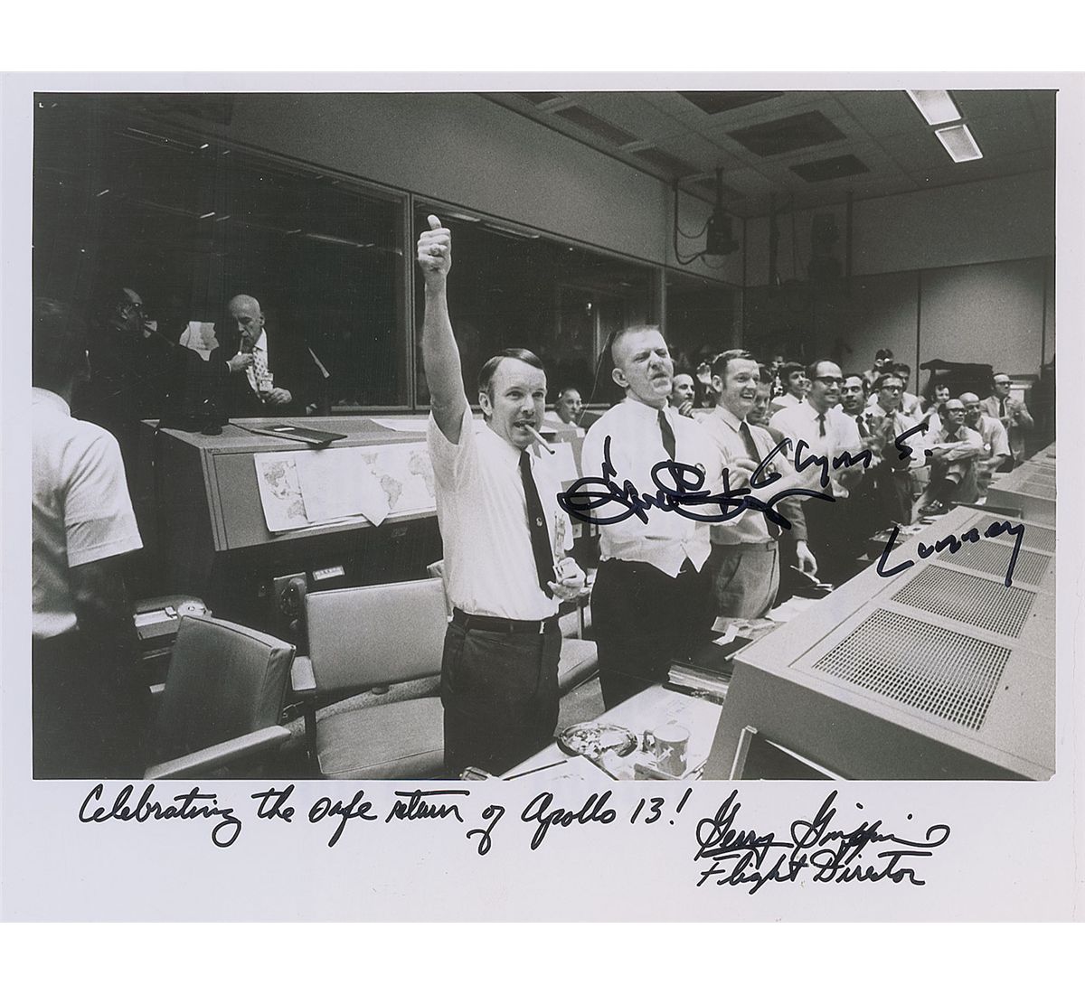 Official glossy 10 x 8 NASA photo of the Apollo 13 mission control celebration after the mission’s splashdown, signed in black felt tip by Gene Kranz, Glynn Lunney, and Gerry Griffin, who adds, “Celebrating the safe return of Apollo 13!” In fine condition, with some scattered light edge creases.