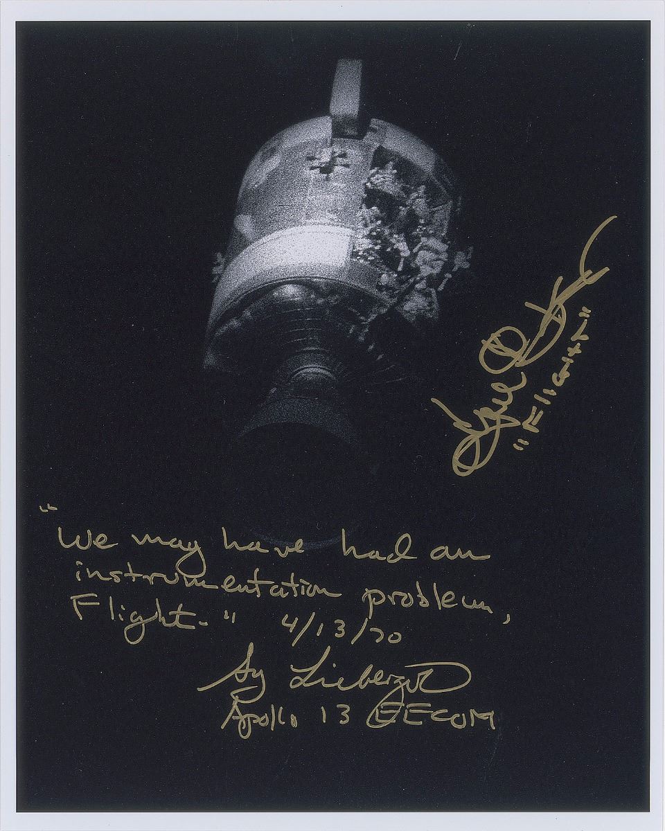 Satin-finish 8 x 10 photo of the damaged Apollo 13 capsule, signed in gold ink, “Gene Kranz, ‘Flight’” and “‘We may have had an instrumentation problem, Flight,’ 4/13/70, Sy Liebergot, Apollo 13 EECOM.” In fine condition.