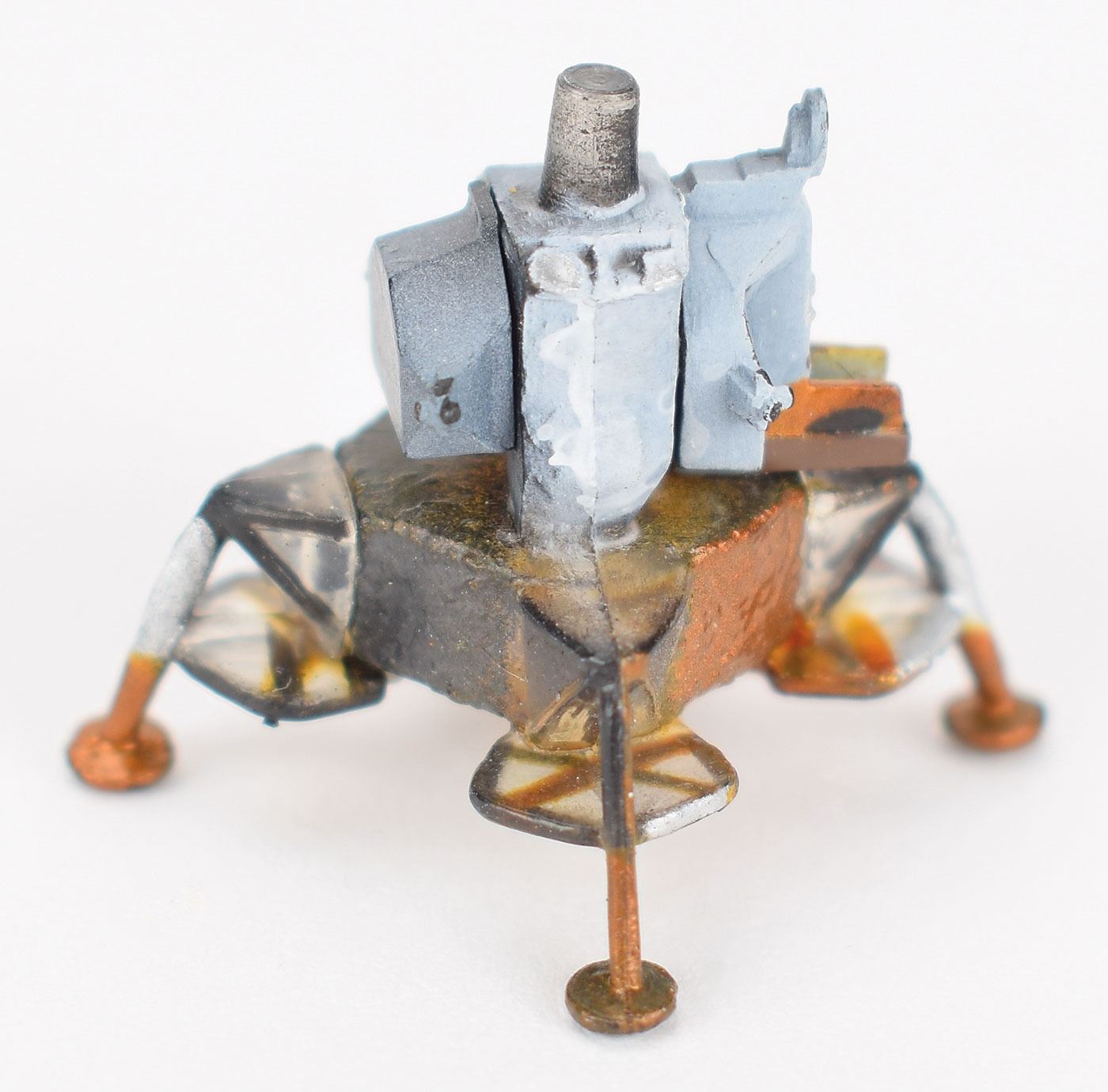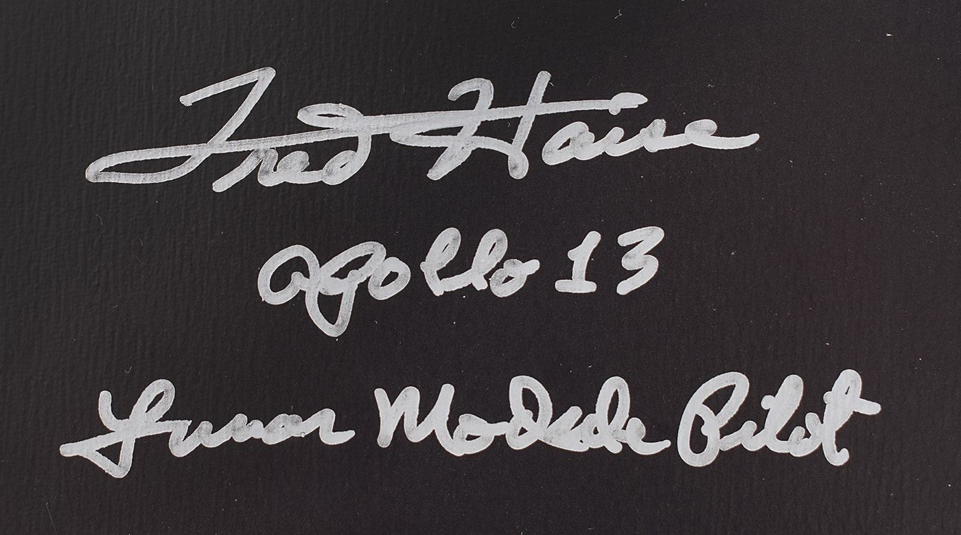 Desirable desk model of the docked Apollo 13 Command/Service and Lunar Modules in lunar orbit, standing 2? in height and displayed on a black 4.25? x 6? base, which is signed in silver ink, "Fred Haise, Apollo 13, Lunar Module Pilot." The LM is capable of separating from the visibly damaged CSM. In fine condition.