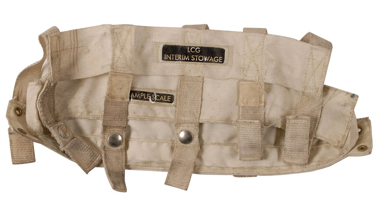 Prop LM stowage bag from the 1995 film Apollo 13. Bag measures approximately 14 x 6.5, and is labeled at the top, “LCG Interim Stowage,” with another label reading “Sample Scale.” In very good condition, with expected distress and soiling.