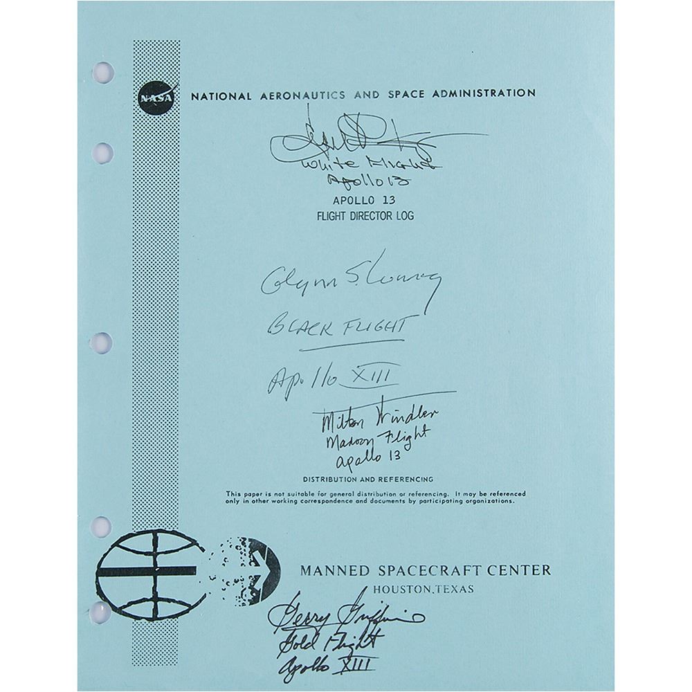 Complete copy of the ‰ÛÏApollo 13 Flight Director Log,‰Û contained in a 3-inch binder with over 200 pages and supplements, signed on the cover page in black ink or ballpoint by the mission‰Ûªs four shift flight directors, ‰ÛÏEugene F. Kranz White Flight Apollo 13,‰Û ‰ÛÏGlynn S. Lunney, Black Flight, Apollo XIII,‰Û ‰ÛÏMilton Windler, Maroon Flight, Apollo 13,‰Û and ‰ÛÏGerry Griffin, Gold Flight, Apollo XIII.‰Û