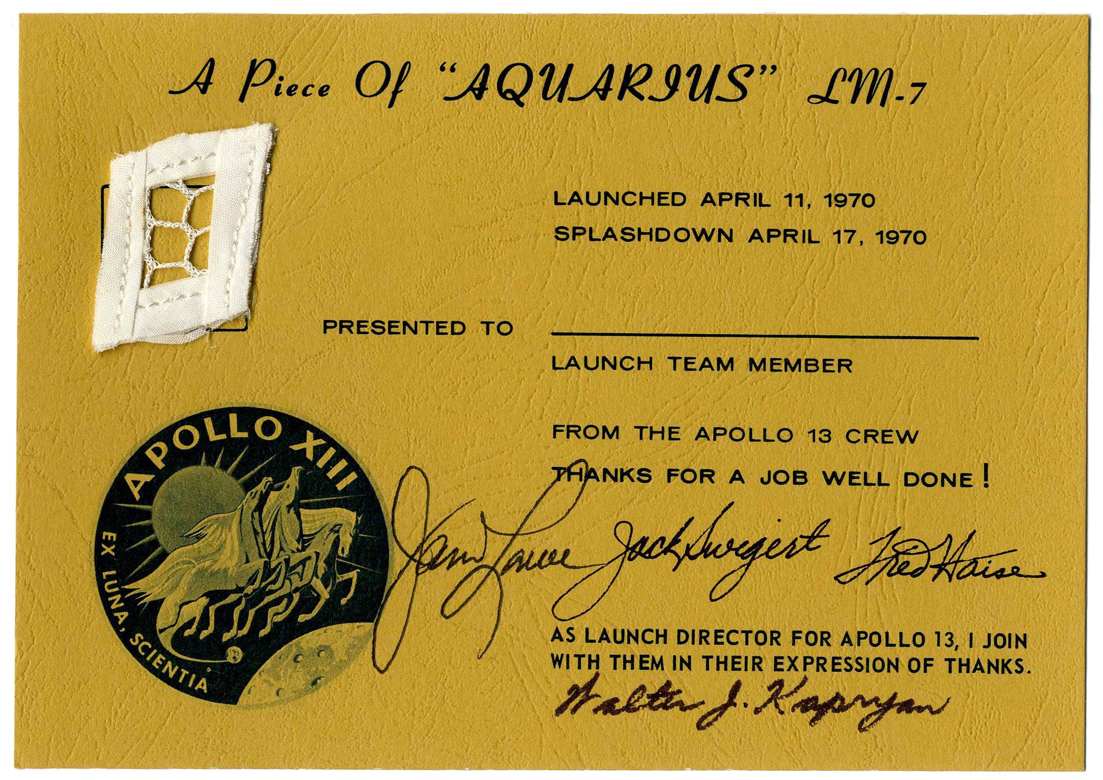 Official piece of material from the Apollo 13 lunar module Aquarius, which brought the astronauts home to safety during the 1970 NASA mission. With a signed COA reading ''A Piece of 'Aquarius' LM-7...From the Apolo 13 Crew / Thanks for a job well done!'' With signatures from Jack Lovell, Jack Swigert and Fred Haise as well as the Apollo 13 launch director. Aquarius material, measuring 1'' x 1'' is taped to yellow COA measuring 7'' x 5''. Fine condition.