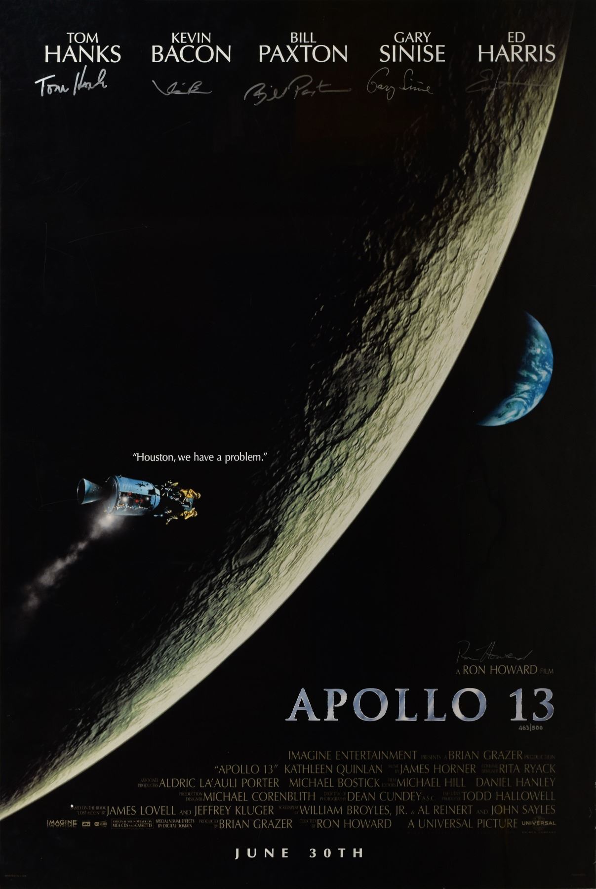 Phenomenal limited edition color 26.75 x 39.75 one-sheet movie poster for the 1995 film Apollo 13, numbered 463/500, signed in silver ink by Tom Hanks, Kevin Bacon, Bill Paxton, Gary Sinise, Ed Harris, and Ron Howard. Rolled and in fine condition, with some light edge creasing. Accompanied by a certificate of authenticity from Universal Studios.