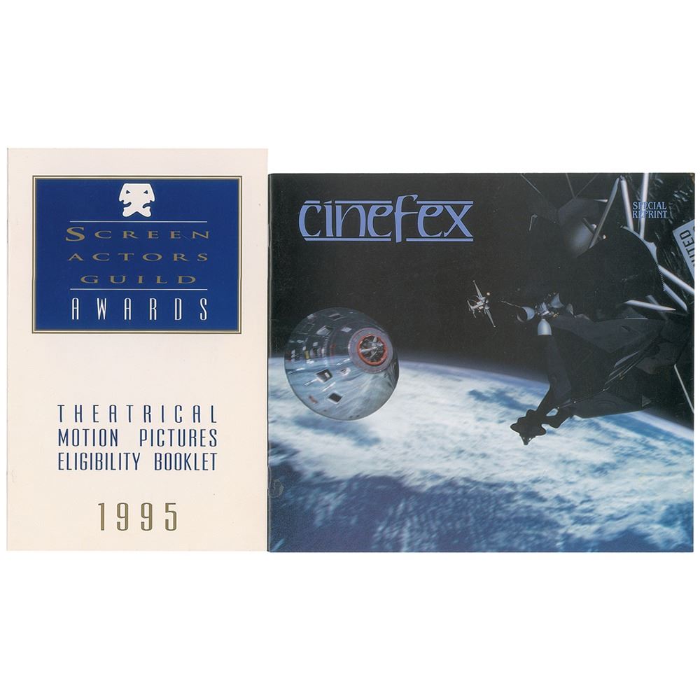 Screen Actors Guild (SAG) voting package for the 1995 space docudrama film Apollo 13, including: a Theatrical Motion Pictures Eligibility Booklet for the 1995 SAG Awards; a special reprint Cinefex booklet for Apollo 13, Vol. 63, Sept. 1995; a group of three color Universal City Studios promotional posters for Apollo 13, ranging in size from 10.75 x 14.5 to 16.75 x 11, with each listing categories and potential nominees for the award season; and a typed letter from SAG regarding the 1995 SAG Awards, dated December 30, 1995, in part: “Congratulations! You have been randomly selected as one of 2100 Guild members in good standing to vote for nominations for Outstanding Performances in Theatrical Motion Pictures for the Second Annual Screen Actors Guild Awards.” In overall fine condition.