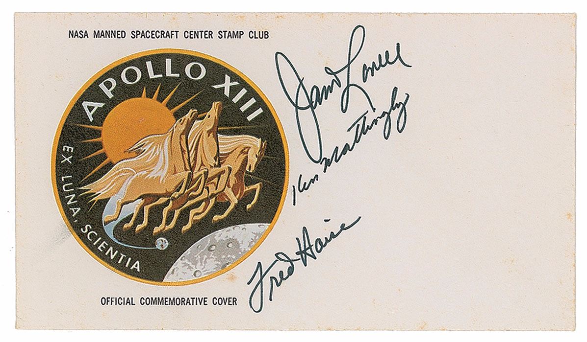 Desirable ‘Type 1’ insurance cover with a cachet of the Apollo 13 mission insignia, signed in black felt tip by the original prime crew of James Lovell, Ken Mattingly, and Fred Haise. In fine condition, with some light spots of foxing, mainly confined to edges. From the collection of aerospace memorabilia specialist Ken Havekotte.