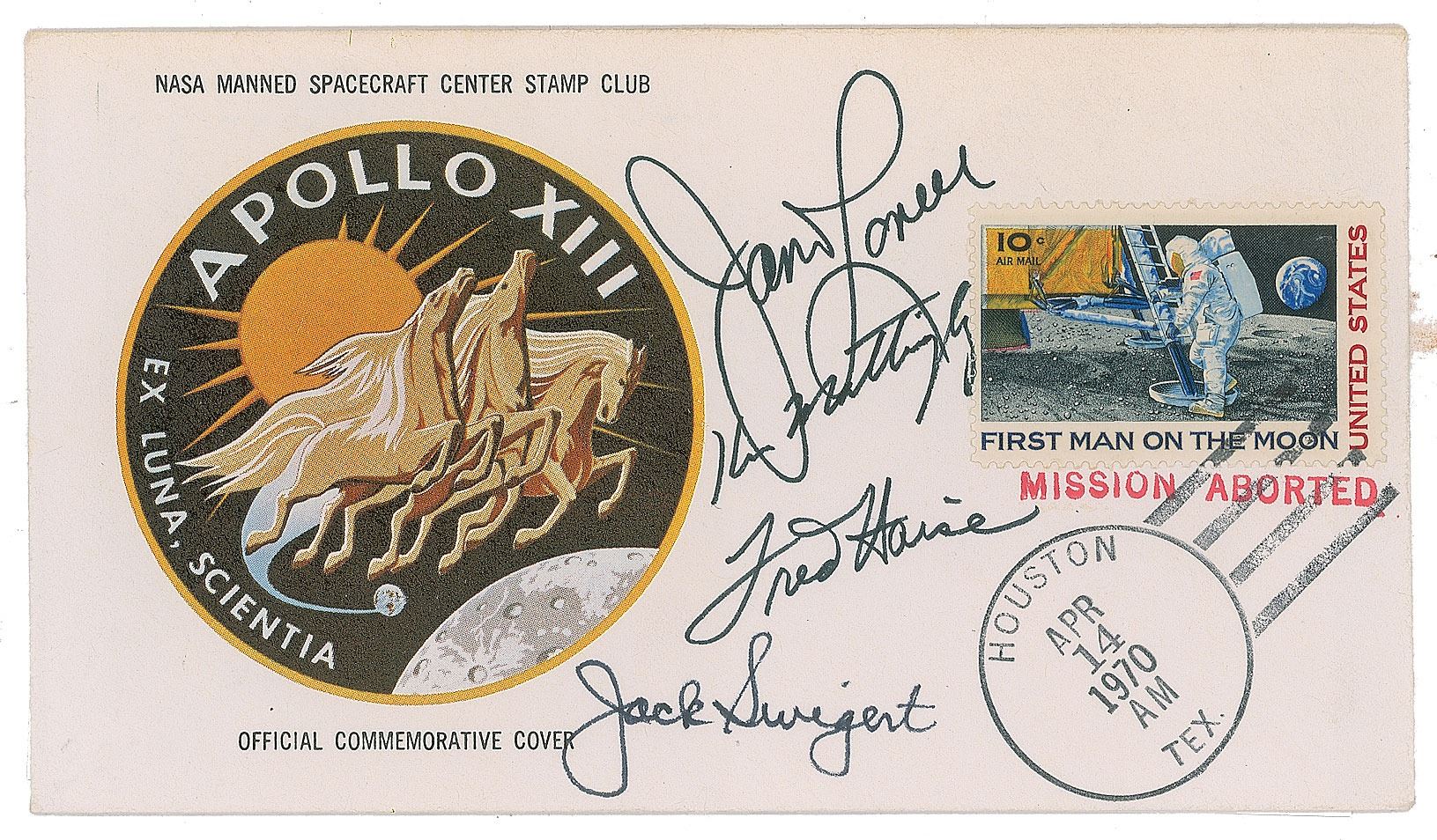 Hugely appealing 'Type 1 insurance-style' cover with a color cachet of the Apollo 13 mission emblem, with uncommon "Mission Aborted" postmark of April 14 1970, the date of the service module's oxygen tank explosion, signed in black felt tip by James Lovell, Ken Mattingly, Fred Haise, and Jack Swigert. In very fine condition. A particularly scarce cover boasting signatures from four crew members, including the uncommon pairing of original and backup CMPs Mattingly and Swigert. A rare and exceptional Apollo 13 offering.