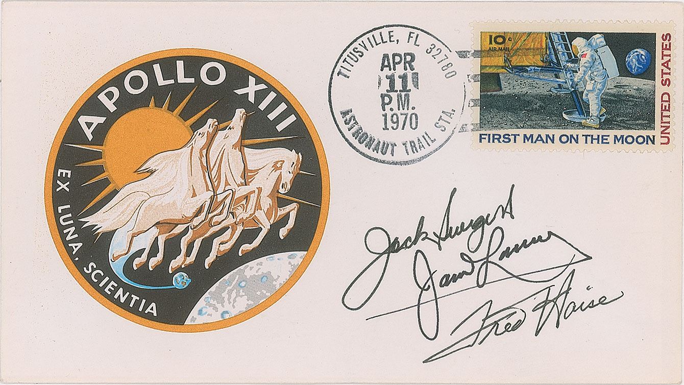Launch day cover with a color cachet of the Apollo 13 mission insignia, postmarked at Titusville, Florida, on April 11, 1970, signed neatly in black ink by Jack Swigert, James Lovell, and Fred Haise. In very fine condition.