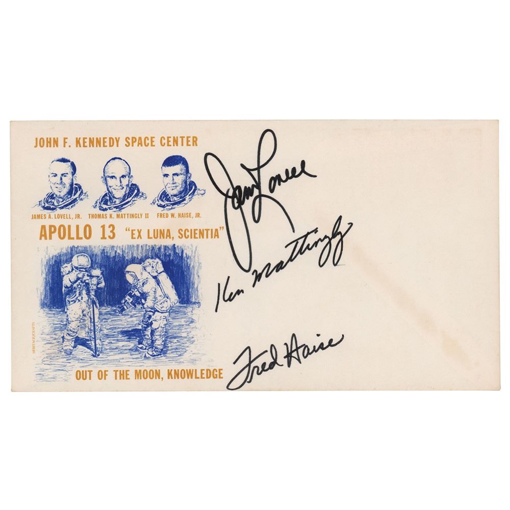 Commemorative cover with a color cachet honoring the crew of the Apollo 13 mission, which bears their slogan 'Ex Luna, Scientia,' or 'From the Moon, Knowledge,' signed nicely in black felt tip by James Lovell, Ken Mattingly, and Fred Haise. In fine condition.