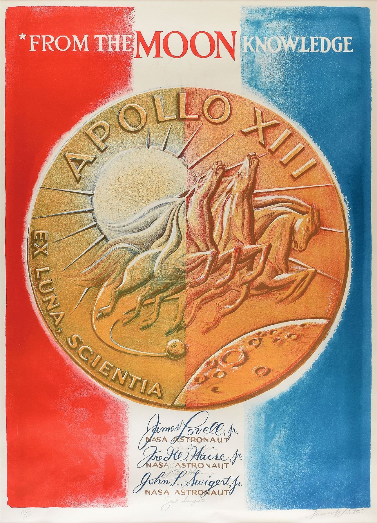 Beautiful color limited edition 21.25 x 29.5 lithograph honoring Apollo 13 by Lumen Winter entitled 'From the Moon, Knowledge,' numbered 69/150, signed in pencil by James Lovell, Fred Haise, and Jack Swigert, each signing below his calligraphically designed name. Also signed in the lower border in pencil by the artist, Lumen Winter, who designed the 'Steeds of Apollo' insignia for Apollo 13. Handsomely double-matted and framed to an overall size of 30 x 38.5. In fine condition.