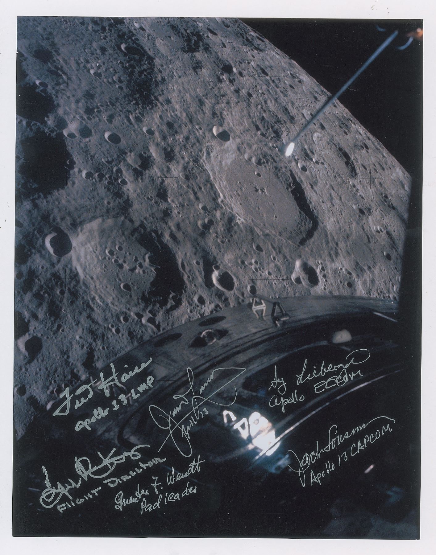 Desirable color satin-finish 11 x 14 photo of Apollo 13 passing the moon, signed in silver ink, "Fred Haise, Apollo 13 LMP," "James Lovell, Apollo 13," "Jack Lousma, Apollo 13 CAPCOM," "Eugene F. Kranz, Flight Director," "Guenter F. Wendt, Padleader," and "Sy Liebergot, Apollo EECOM." In very good to fine condition, with scattered light creasing.