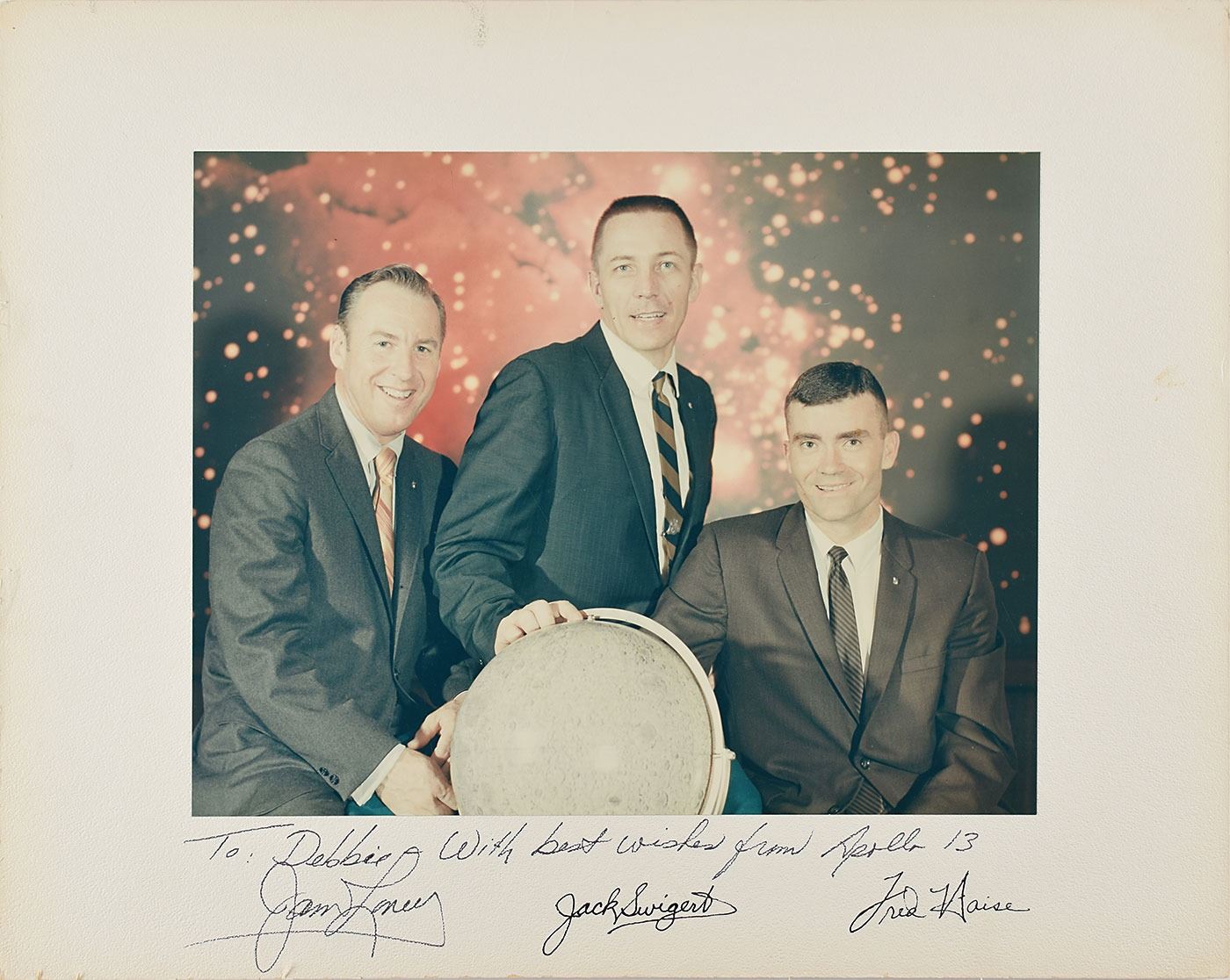 Oversized official color semi-glossy 13.75 x 10.75 NASA photo of the crew of Apollo 13 posing with a lunar globe, affixed to the original 20 x 16 mount, signed and inscribed on the mount in black felt tip, "To: Debbie with best wishes from Apollo 13, James Lovell," "Jack Swigert," and "Fred Haise.” In fine condition, with two light dents to the left edge.