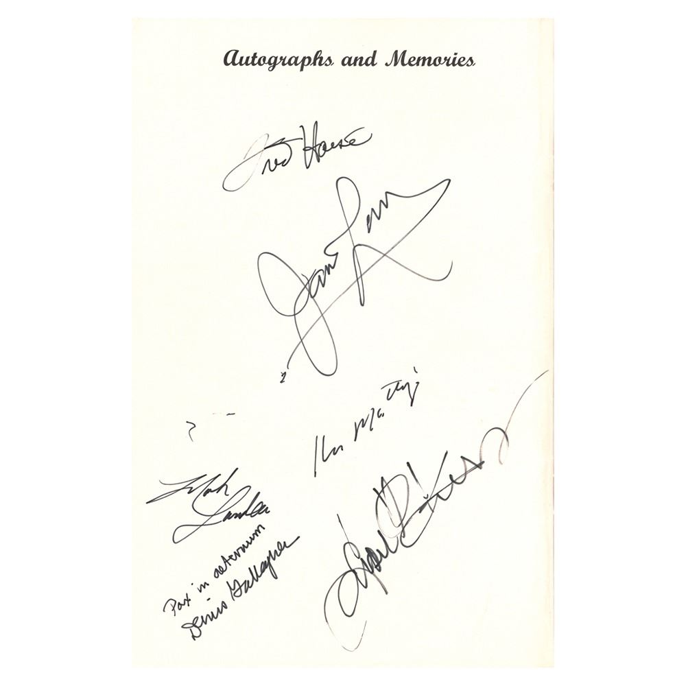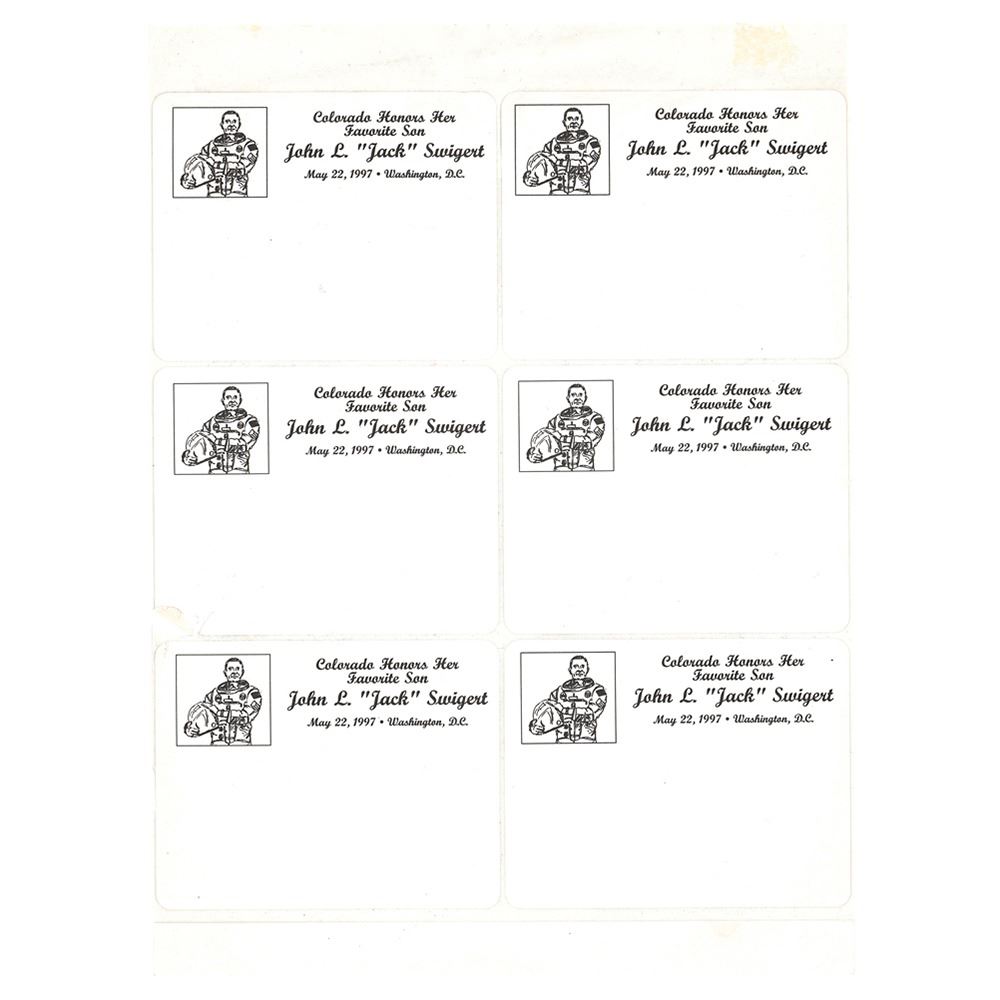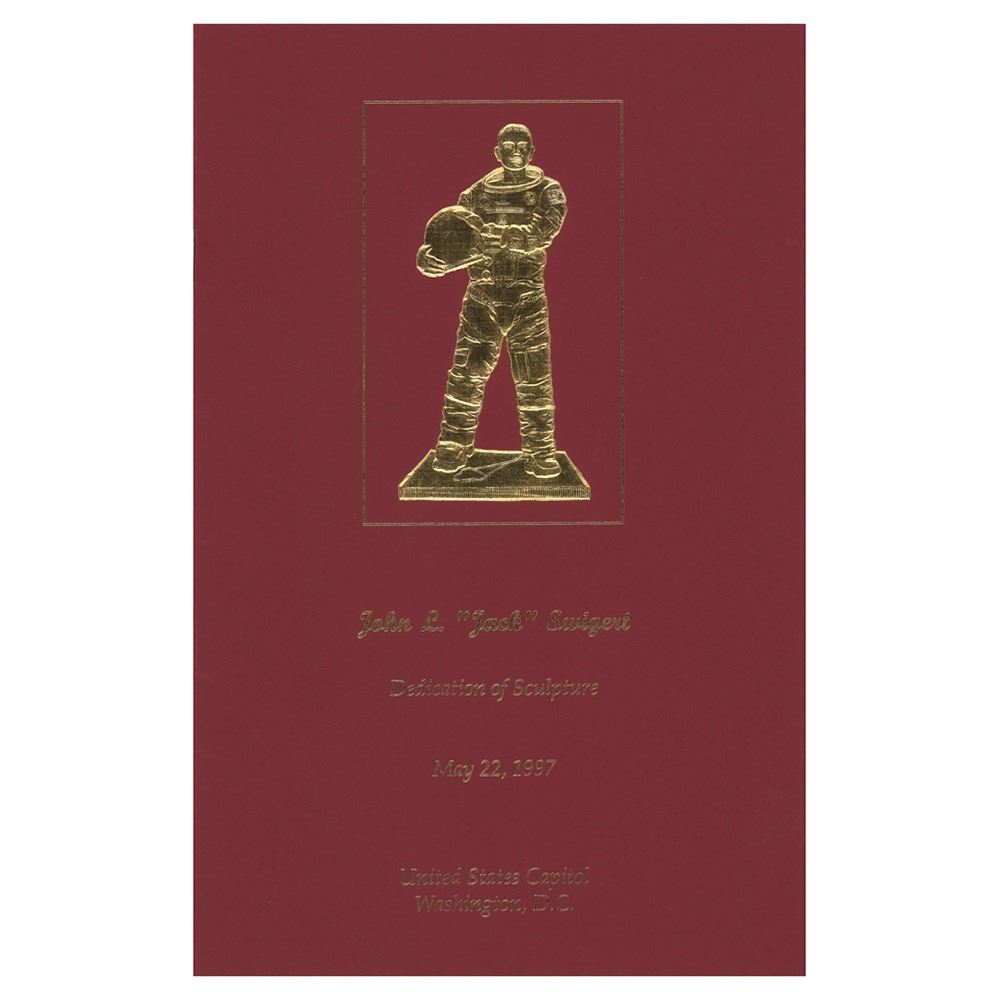 Program for the Jack Swigert Memorial Sculpture Dedication held at the United States Capitol on May 22, 1997, eight pages, 5.5 x 8.5, signed on the designated autograph page in black ink by James Lovell, Fred Haise, and Ken Mattingly. The page is also signed by famed flight director Gene Kranz and Colorado politician Dennis Gallagher. In fine condition, with a light crease to the lower right corner of the signed page. Accompanied by a letter of provenance from the original recipient, as well as a sheet of six unused name tags from the event.