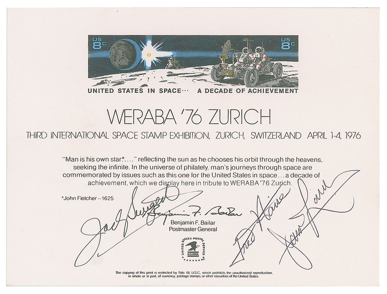 Commemorative color 8 x 6 print issued by the United States Postal Service in honor of the Third International Space Stamp Exhibition held in Zurich, Switzerland between April 1–4, 1976, signed in ink or ballpoint by the full Apollo 13 crew: James Lovell, Fred Haise, and Jack Swigert. In very fine condition. Accompanied by a certificate of authenticity from the Astronaut Scholarship Foundation for the Lovell signature.