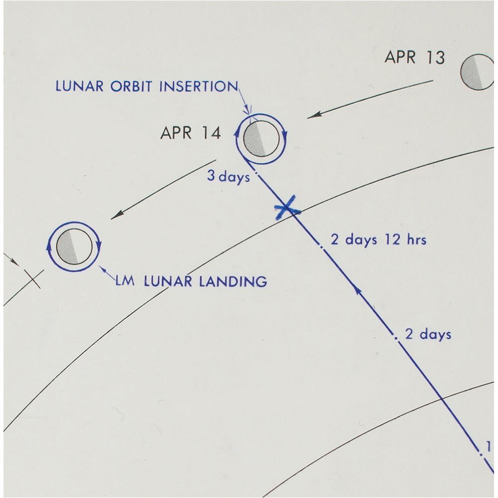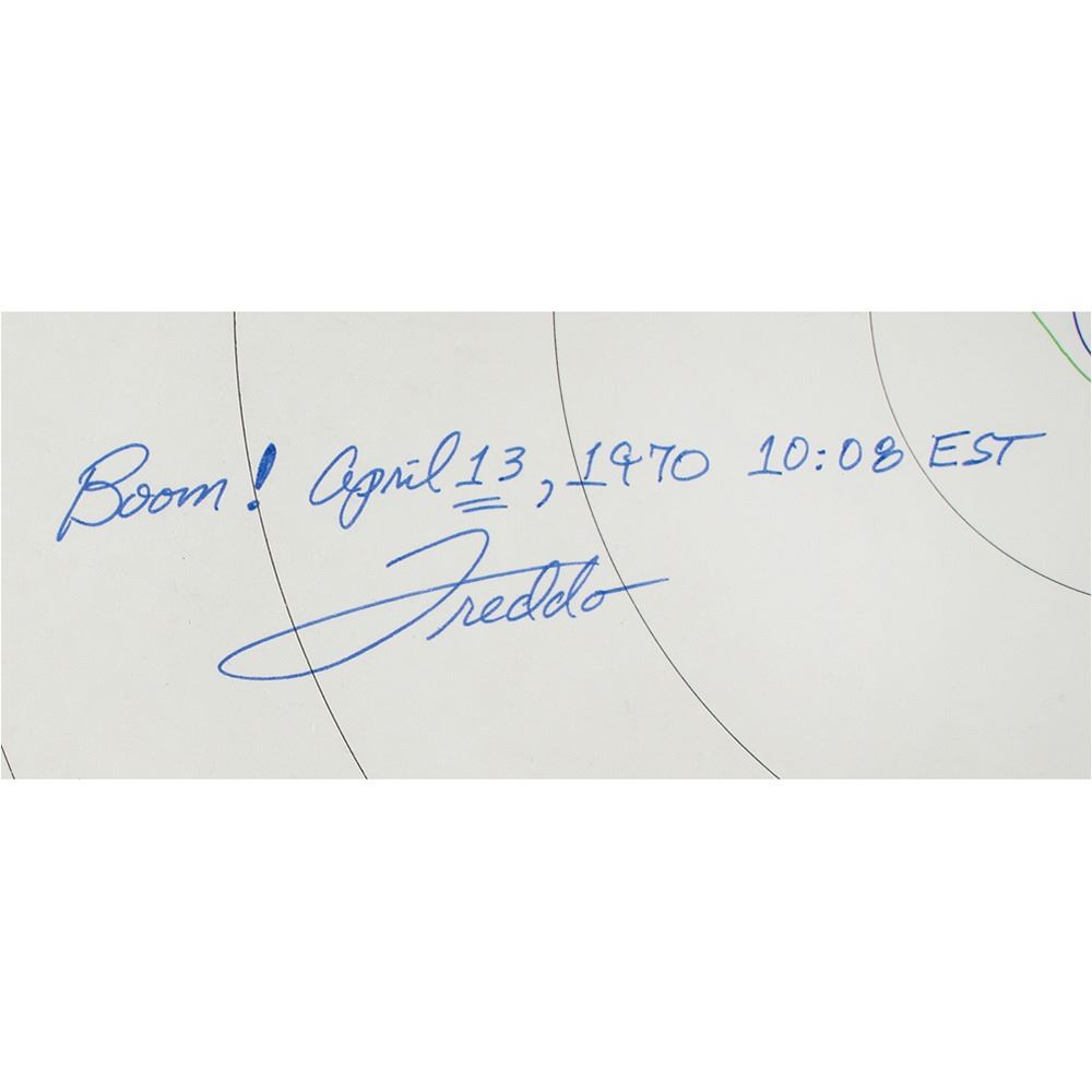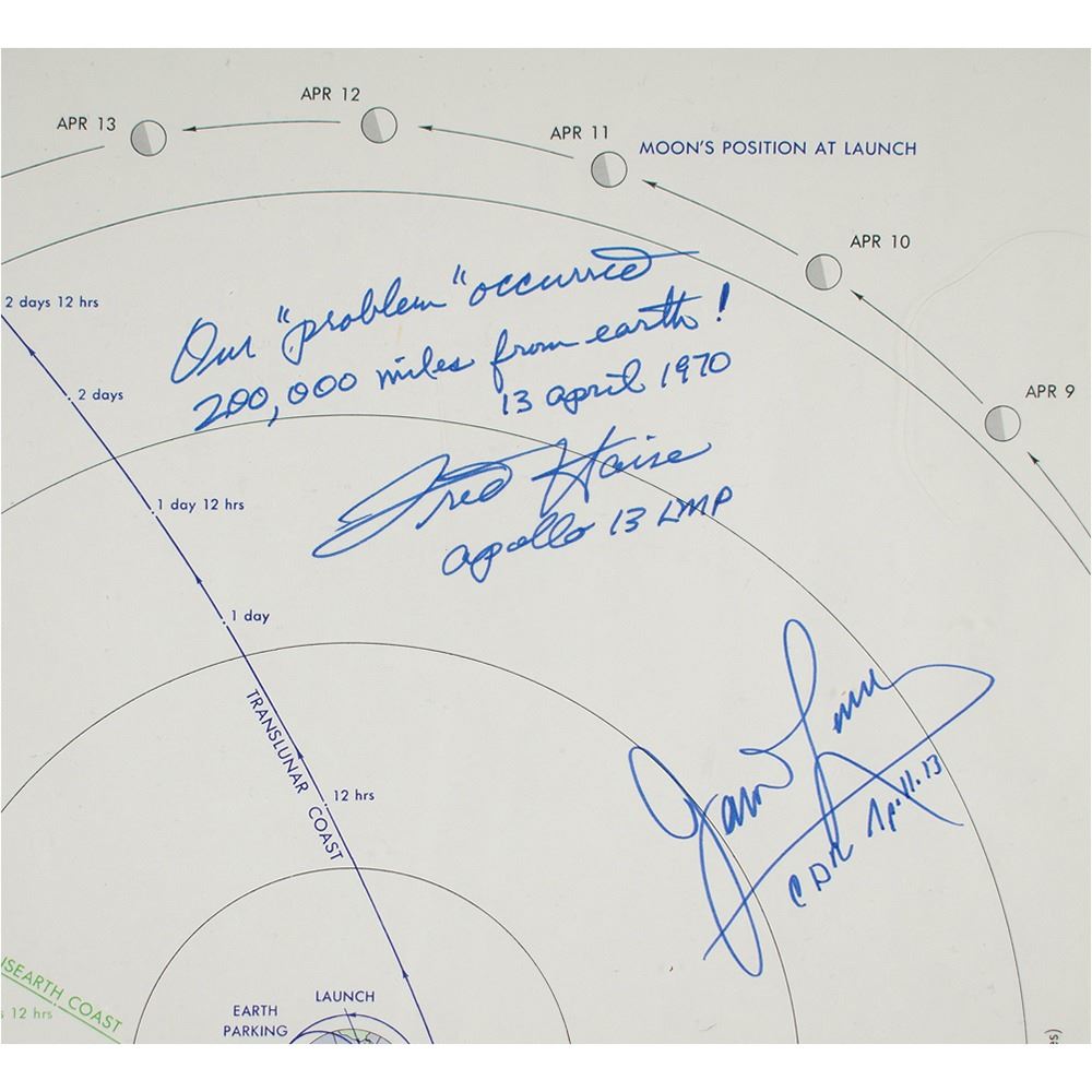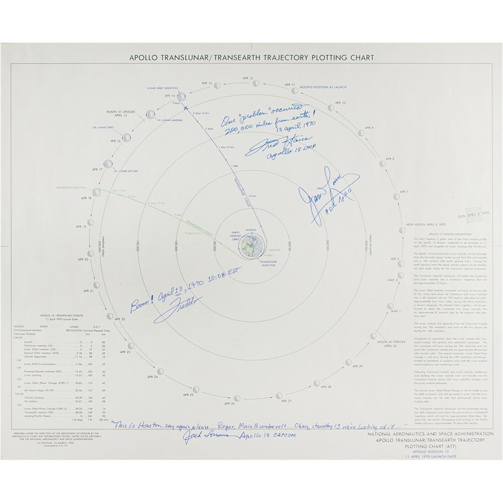 Color first edition Translunar/Transearth Trajectory Plotting Chart for the Apollo 13 mission, 24 x 20, dated March 16, 1970, displaying a polar view of the lunar mission profile for Apollo 13, showing the various significant events during the 10-day mission. Signed in blue felt tip, "James Lovell, CDR Apollo 13," "Our 'problem' occurred 200,000 miles from earth! 13 April 1970, Fred Haise, Apollo 13 LMP," who marks with an "X" where the explosion happened on the flight path and adds "Boom! April 13, 1970 10:08 EST, Freddo," and "'This is Houston, say again please‰Û_Roger, Main B undervolt‰Û_Okay, standby 13 we're looking at it‰Û_,' Jack Lousma, Apollo 13 CAPCOM." Lithographed by ACIC 3-70, and prepared under the direction of the Department of Defense by the Aeronautical Chart and Information Center. Rolled and in fine condition.
