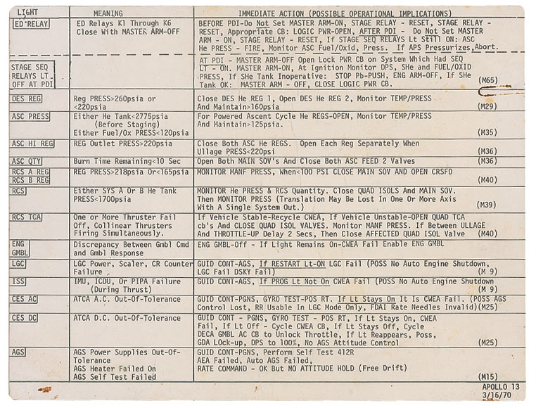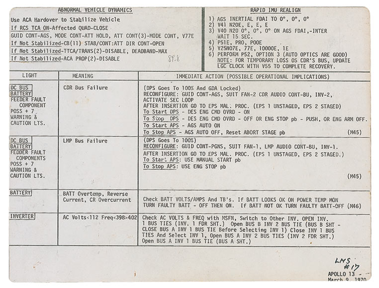 Two-sided lunar module emergency procedures cue card. One side of this particular checklist page bears a handwritten notation “LMS #17” and the printed notation “Apollo 13, March 9, 1970,” and is believed to have been used by astronaut Charlie Duke as a member of the back-up crew. The page measures 10.25 x 8. In fine condition, with light handling wear, areas of toning and soiling, and a rust spot in the shape of a paperclip impression.A particular riveting item from one of the most harrowing—and nearly fatal—Apollo flights.