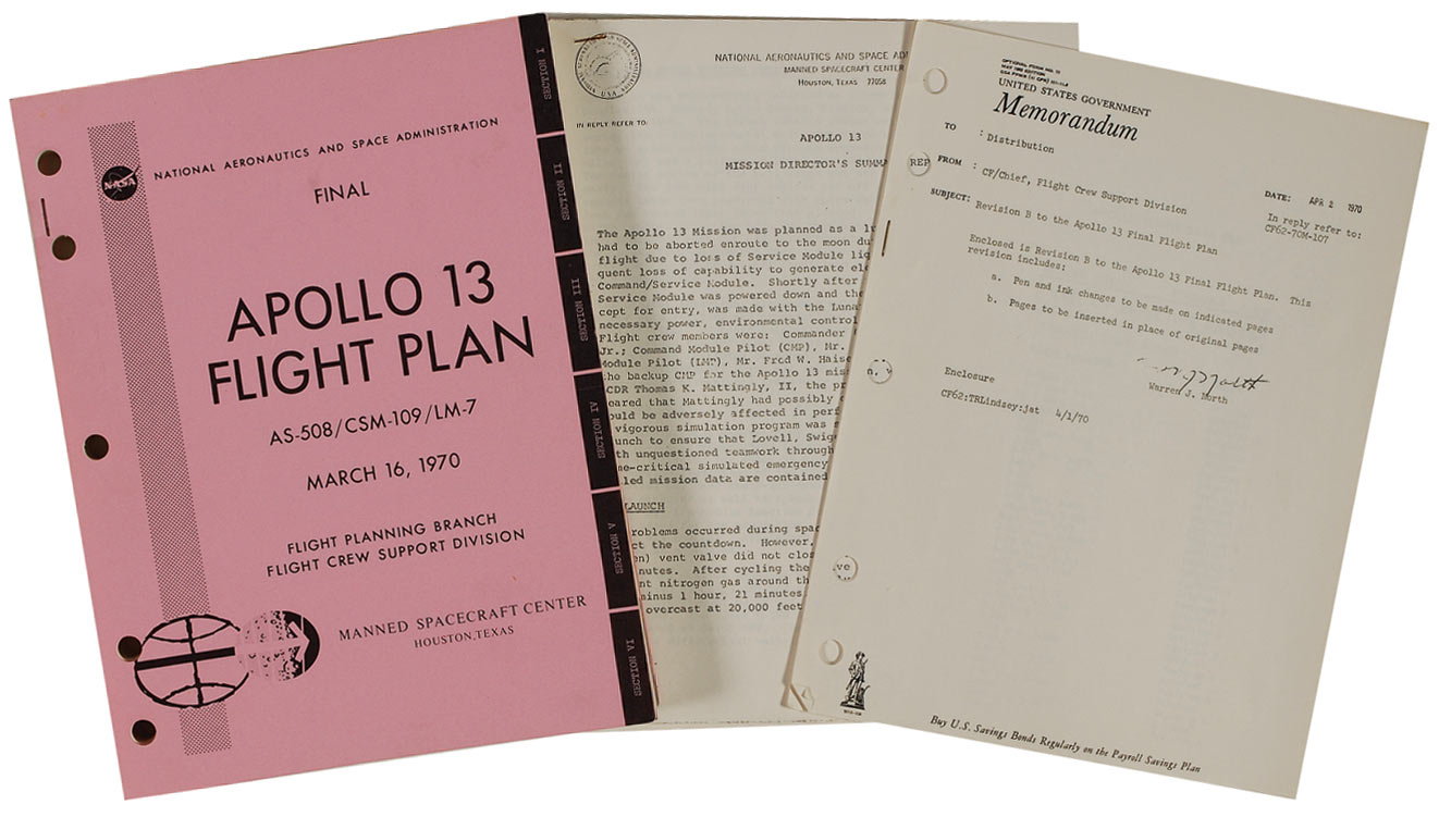 A printed Apollo 13 final Flight Plan, “AS-508/CSM-109/LM-7,” dated March 16, 1970, measuring 8 x 10.5, bound by a staple to top left corner, and providing a minute-by-minute time frame for the entire mission, including the test of the lunar module. First page is a copy of the flight plan submission bearing copies of signatures of T. R. Lindsey, Warren J. North, Deke Slayton, James McDivitt, and Sigurd Sjoberg. Also included are two multi-page memorandums revising the final flight plan, dated March 26 and April 2, 1970 respectively, and a 14 page copy of the Mission Director’s Summary Report, detailing the mission difficulties. In fine condition.