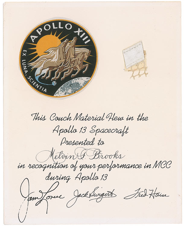 Flight-flown couch material swatch, 1 x 1.5, flown aboard the Apollo 13 mission. Swatch is affixed to an 8 x 10 presentation sheet with an Apollo 13 beta cloth patch, which reads, “This couch material flew in the Apollo 13 Spacecraft presented to Melvin F. Brooks in recognition of your performance in MCC during Apollo 13.” Signed at the bottom in black ink by James Lovell, Jack Swigert, and Fred Haise. In fine condition.